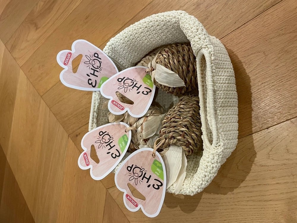 Zabawki EHOP dla małych ssaków o kształcie marchewki lub rzodkiewki została wykonana ze 100% naturalnego włókna trawy morskiej lub kukurydzy. Nie zawiera żadnych barwników. Dołączona kartonowa etykieta ze sznurkiem z rafii.