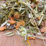 Karma uzupełniająca jest mieszanką bezzbożową i zawiera siano, zioła, kwiaty, warzywa korzenne i owoce.