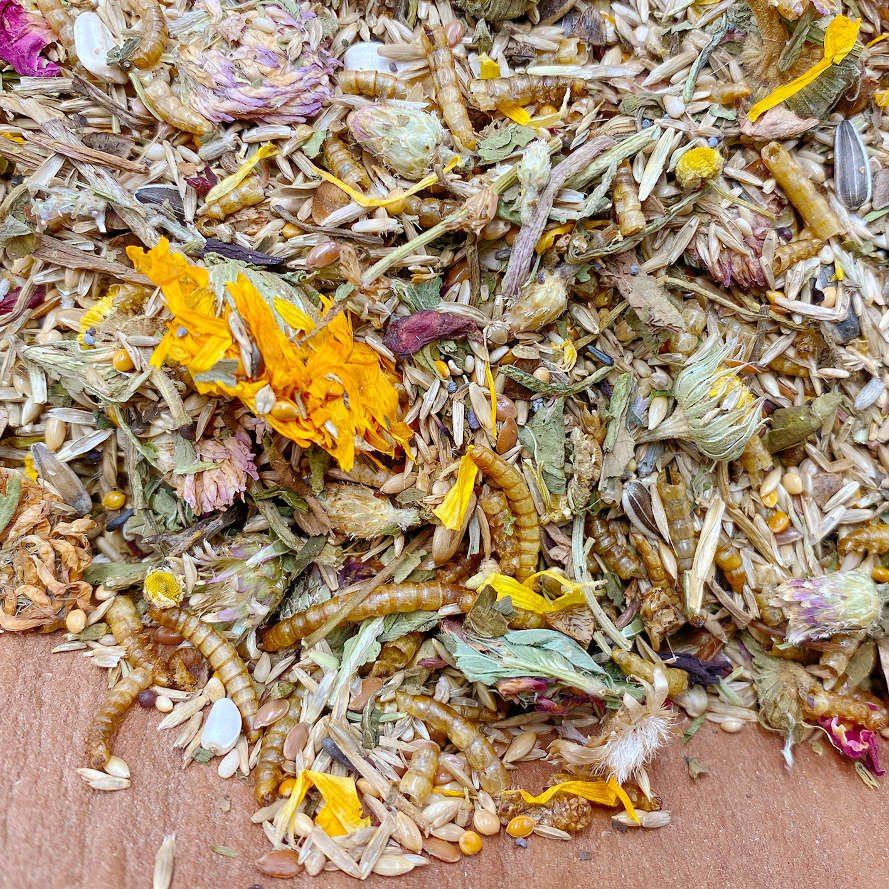 Skład: Ziarno mozgi kanaryjskiej, nasiona traw, proso żółte, gryka, siemię lniane, proso czerwone, ziarna sezamu, nasiona słonecznika, larwy mącznika, liście mniszka lekarskiego, proso srebrne, nasiona nasiona, rzepa, proso senegalskie, nasiona konopi, kardi, proso japońskie, nasiona konopi, mak niebieski, kwiaty nagietka, kwiaty bławatka, kwiaty hibiskusa, kwiaty czerwonej koniczyny, kwiaty lawendy, świerszcze, kwiaty nagietka, kwiaty róży.