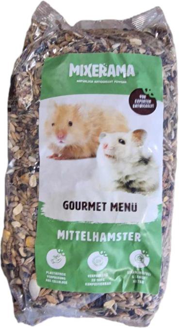 Karma Gourmet Menü jest pełnoporcjową, zbilansowaną mieszanką dla chomików syryjskich marki Mixerama. Mieszanka zawiera 67% nasion mącznych i roślin strączkowych, 24,8% nasion oleistych, 4% białka zwierzęcego, 2,2% warzyw i 2% kwiatów.