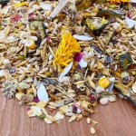 Skład: Pszenica, gryka, żyto, jęczmień, owies, fasola mung, nasiona konopi, nasiona ostropestu plamistego, płatki jęczmienne, kukurydza, larwy mącznika, groch, pestki dyni, płatki owsiane, nasiona rzodkiewki, rzepa, płatki orkiszowe, ryż niełuskany, kardi, perilla, nasiona słonecznika, dari, nasiona roszponki, plasterki ogórka, cukinia, kwiaty bławatka, kwiaty nagietka, kwiaty róży kwiaty czerwonej koniczyny, kwiaty mniszka lekarskiego.