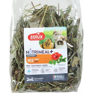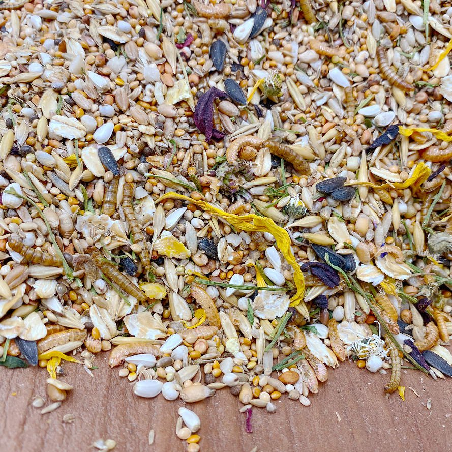 Skład: Proso żółte, proso czerwone, pszenica, jęczmień, owies, żyto, ziarno mozgi kanaryjskiej, płatki owsiane, dari, proso japońskie, proso senegalskie, proso srebrne, sorgo, kardi, nasiona trawy, nasiona słonecznika, kruszone orzeszki ziemne, nasiona marchwi, płatki jęczmienne, nasiona dzikiej róży, siemię lniane, nasiona szpinaku, nasiona konopi, ziarna nigru, perilla, nasiona sezamu, kiełże, larwy mącznika, łodygi pietruszki, płatki kukurydzy, płatki grochu, łodygi kopru, kwiaty hibiskusa, kwiaty nagietka, stokrotki, kwiaty bławatka, kwiaty słonecznika, zielona papryka, płatki pomidora.