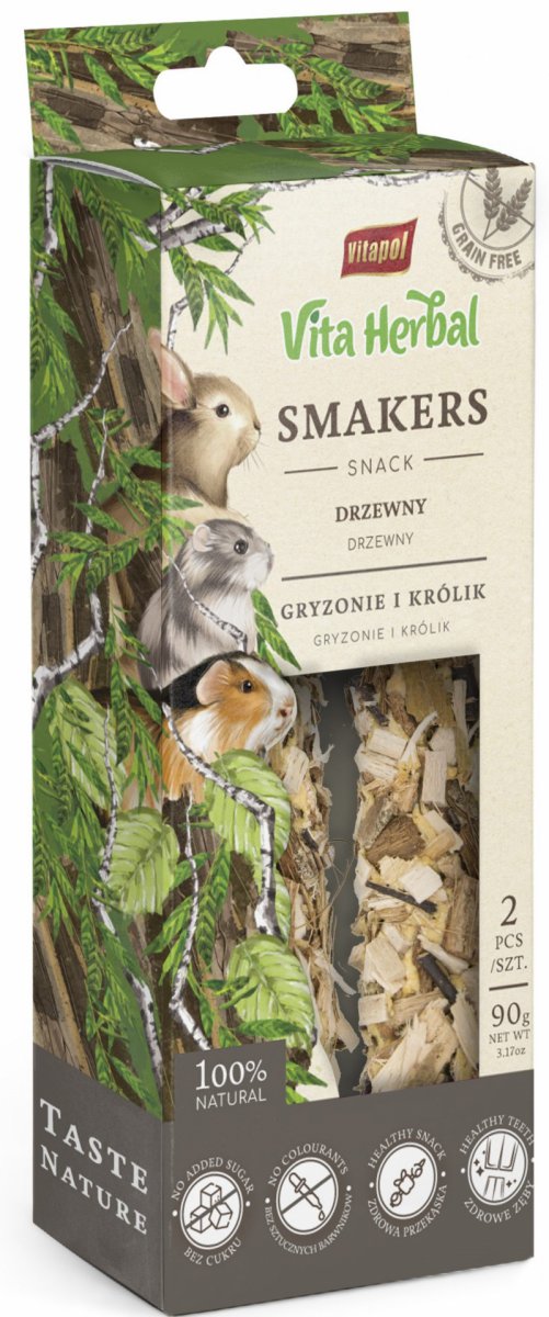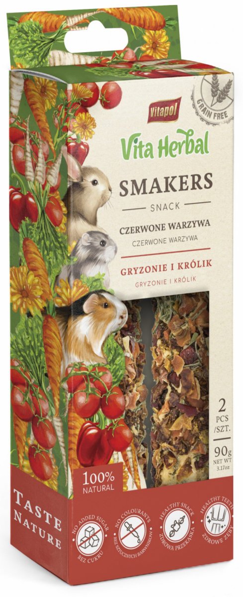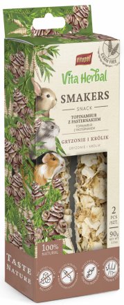 Smakers Vita Herbal to w 100% bezzbożowy, zdrowy przysmak idealny dla każdego gryzonia i królika. Jego twarda struktura dodatkowo pielęgnuje ząbki, wspierając ich regularne ścieranie.