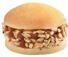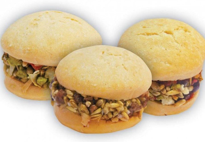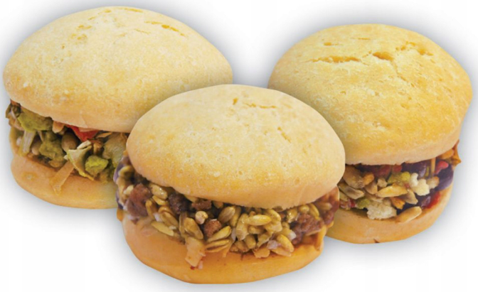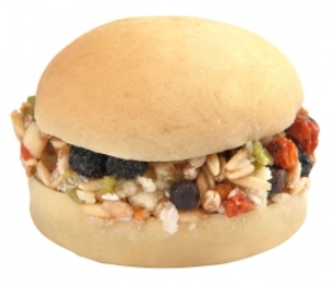 Przysmak uzupełniający dietę, w formie pszennej bułeczki. Wypełniony najlepszymi ziarnami zbóż i kawałkami owoców, warzyw i orzechów. Dostarcza naturalnych witamin, minerałów i pektyn.