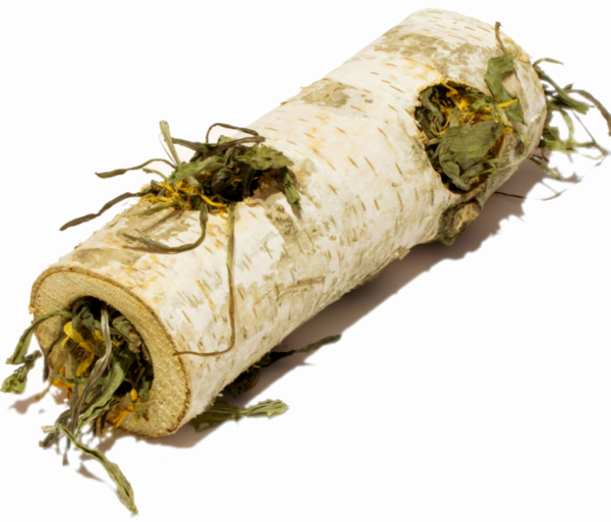 Pieniek brzozowy z ziołami: babką lancetowatą i nagietkiem lub płatkami słonecznika – doskonały do ścierania ząbków i zabicia nudy. Pieniek jest wielokrotnego użytku, można go napychać siankiem, ziołami lub ulubionymi przysmakami.