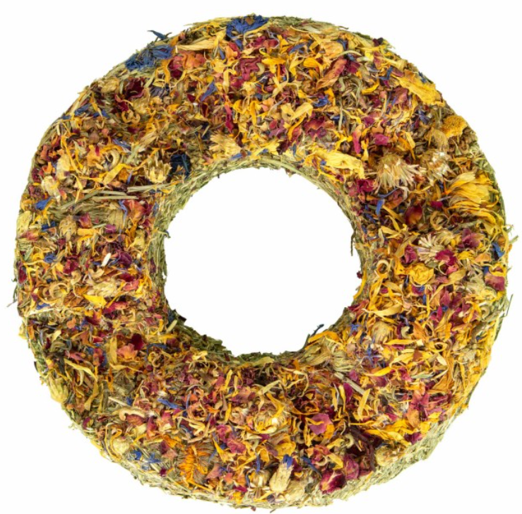 Przysmak wyplatany z zielonego siana łąkowego, z dodatkiem siemienia lnianego oraz posypany mieszanką kwiatów