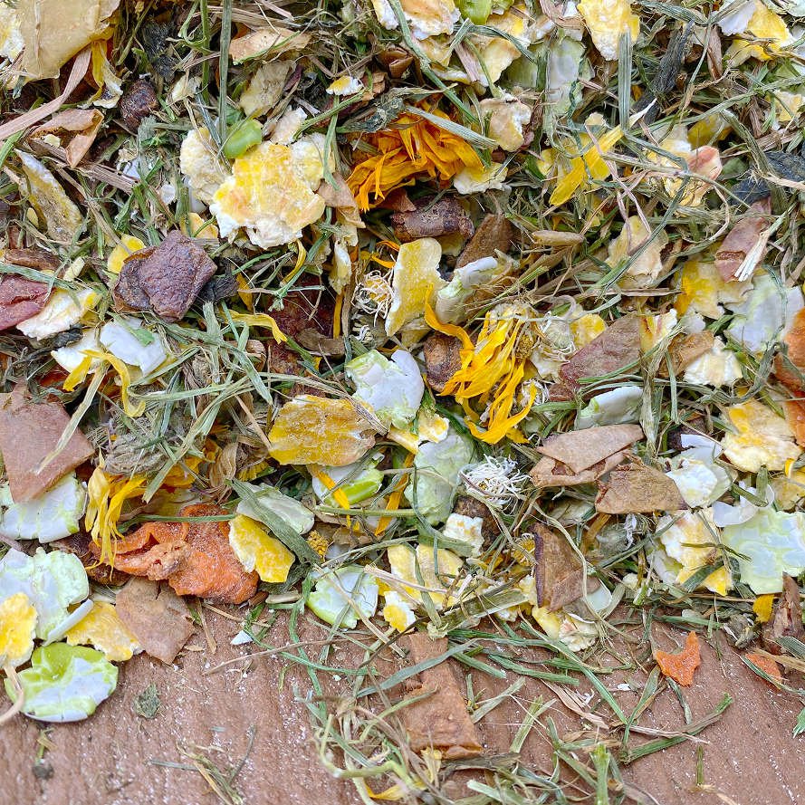 Skład: Płatki z kukurydzy, płatki grochu, miazga jabłkowa, plasterki marchwi, siano z traw łąkowych, łodygi pietruszki, owoce dzikiej róży, kwiaty nagietka, plasterki ogórka, stokrotki.