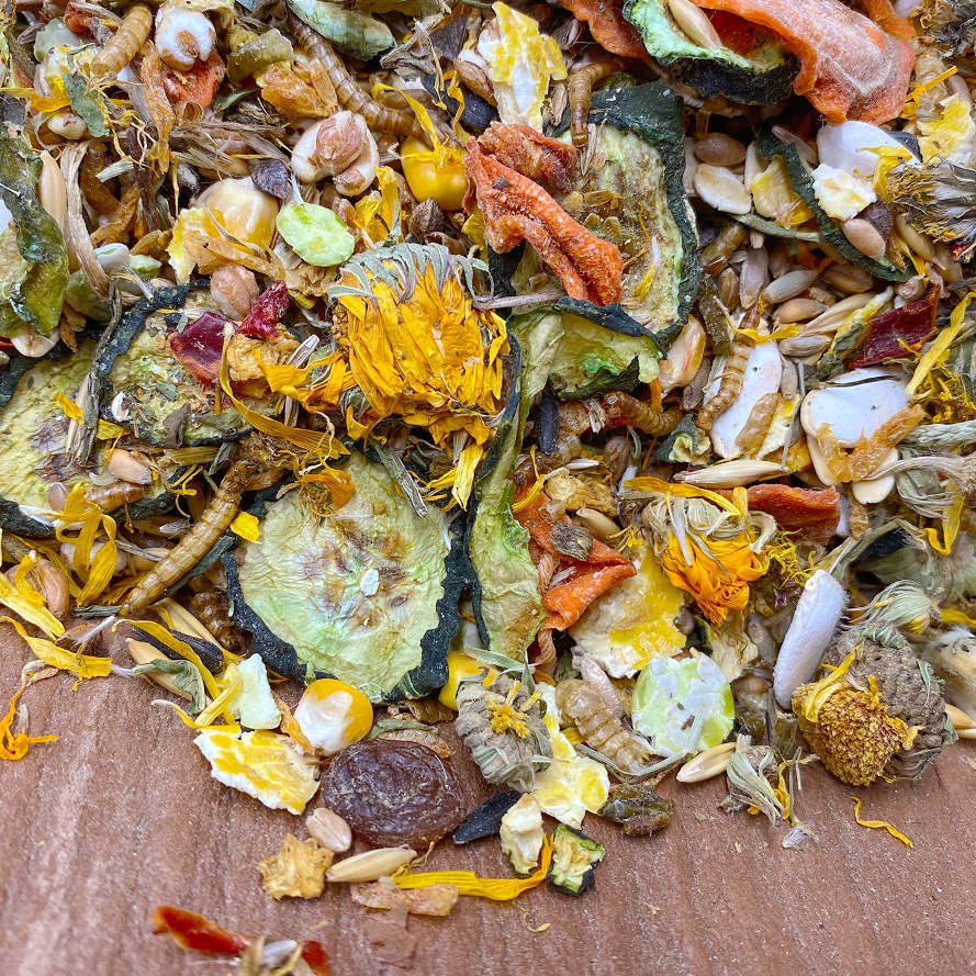 Skład: Pszenica, owies, kukurydza, żyto, gryka, proso żółte, pestki dyni plasterki marchwi, płatki kukurydzy, nasiona traw, płatki grochu, nasiona słonecznika, krewetki słodkowodne, plasterki ogórka, larwy mącznika, kwiaty nagietka, płatki owsiane, pszenica (nieprażona), kwiaty mniszka lekarskiego, zielona papryka, cukinia, rodzynki, liście mniszka lekarskiego, orzeszki ziemne, czerwona papryka.