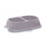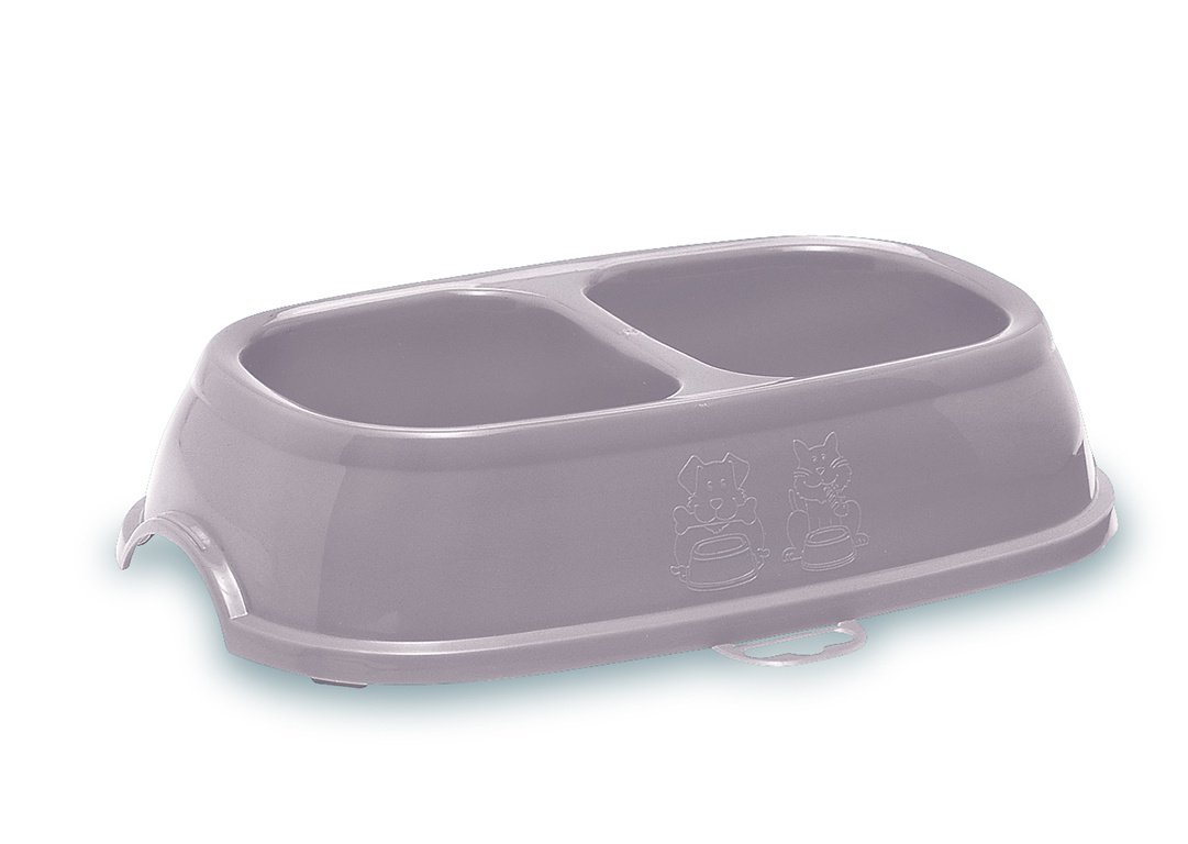 Podwójna, lekka w modnym kolorze miska dla domowego pupila. Przeznaczona zarówno dla psów i kotów. Dwa asymetryczne pojemniki na karmę i wodę. Bardzo praktyczna, wykonana z wysokiej jakości plastiku. Łatwa do utrzymania w czystości. Zamocowane antypoślizgowe gumy zapobiegają ślizganiu się miski.