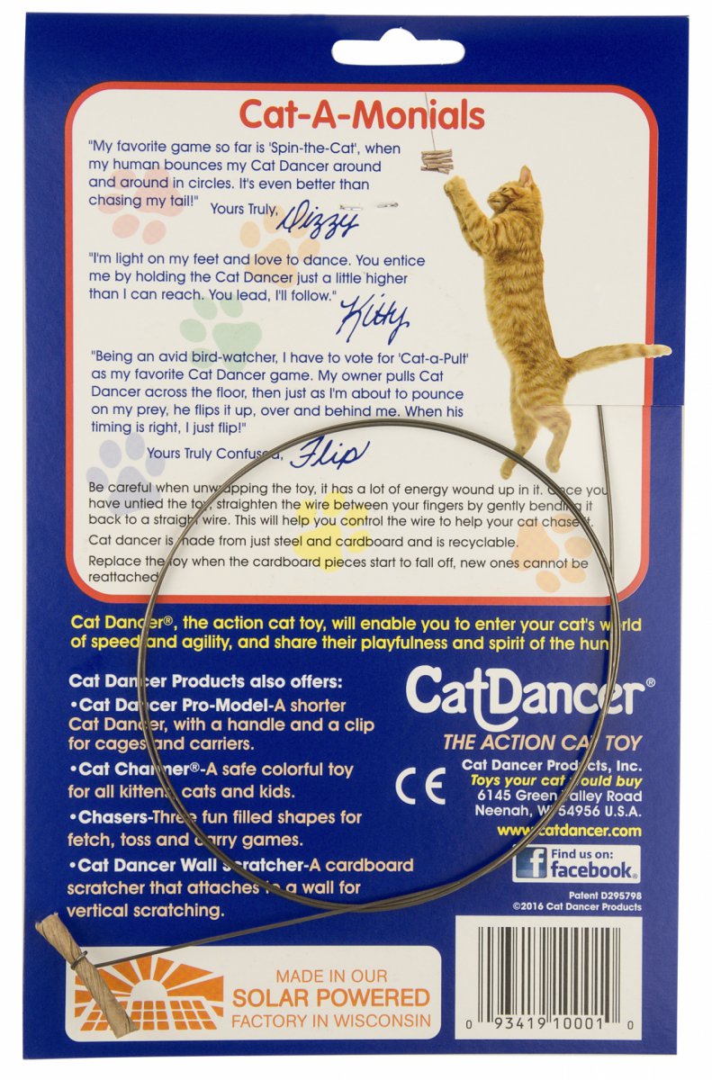 Powodem, dla którego ta wędka sprawia, że koty "tańczą" jest sposób w jaki się porusza. Drut jest wyjątkowo elastyczny i sprężynujący, a kartonowe końcówki lekko się porujaszają i wydają budzący zainteresowanie szmer. Wszystko, co właściciel musi zrobić, to wprowadzić wędkę w ruch, a wtedy końcówka sama zacznie się majtać, huśtać i furkoczeć. Praktycznie wszystkie koty są momentalnie zahipnotyzowane tym szybkim, nieprzewidywalnym ruchem, a ciekawość nie pozwala im oddalić się od zabawki. To wszystko powoduje, że koty zrobią wszystko, aby ją zdobyć - stąd nazwa "Koci Tancerz"!