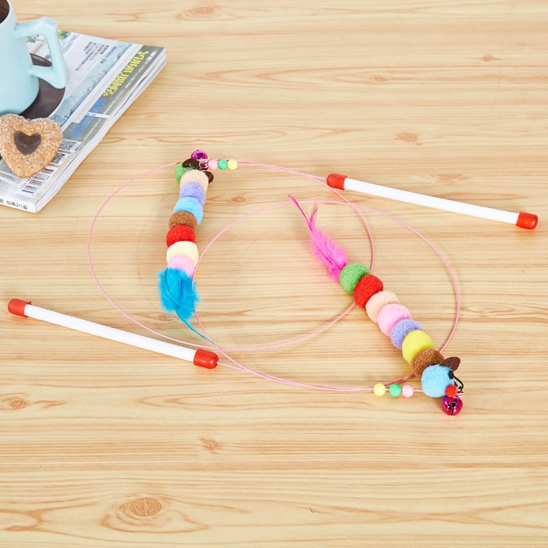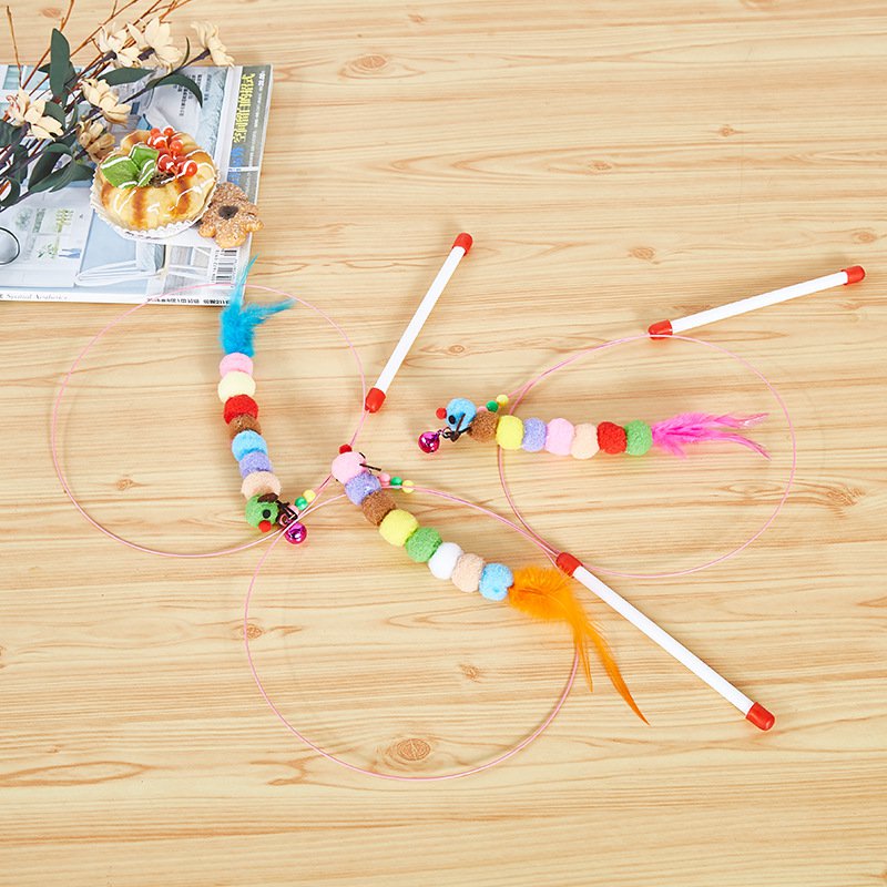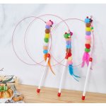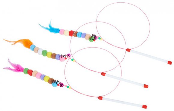 Wędka jest długa i elastyczna, na jej końcu została umocowana pluszowa zabawka z piórkiem i dzwoneczek.