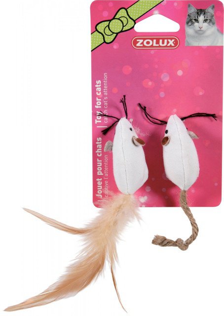 Nietuzinkowa zabawka dla kota! Dwie myszki z piórkami pokryte materiałem odpornym na pazury i zęby. Zabawka zapewni wielogodzinne harce