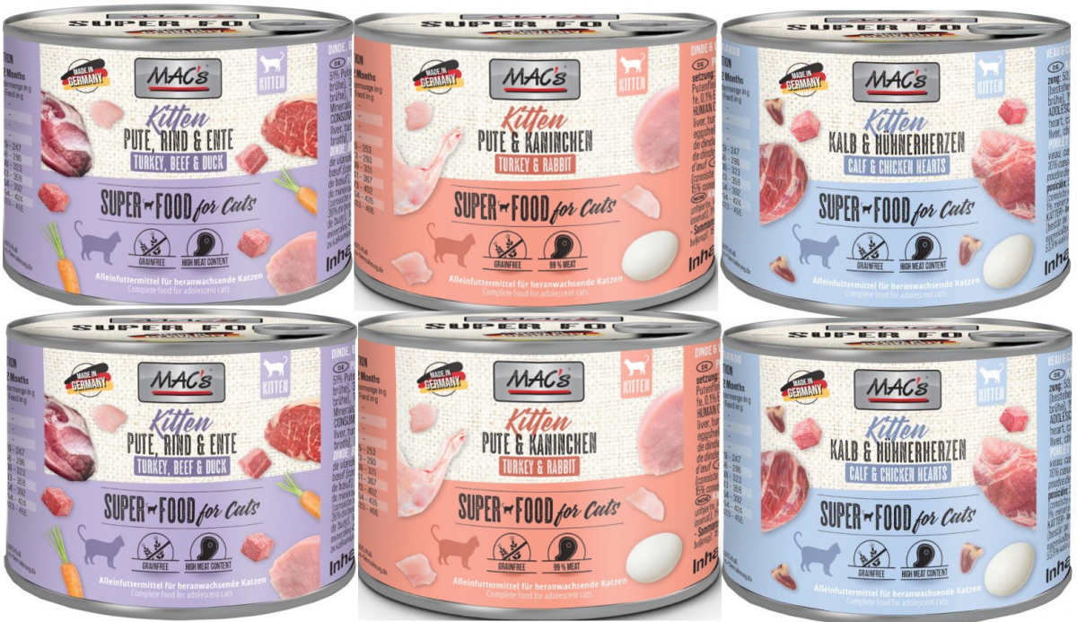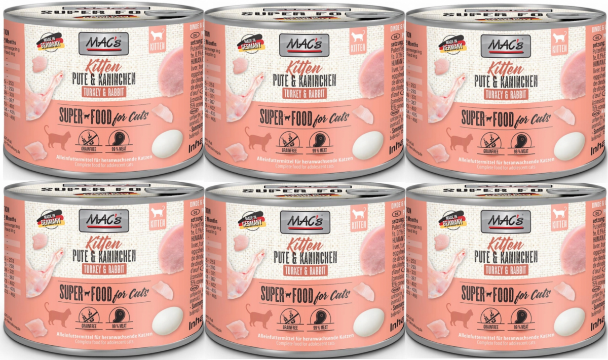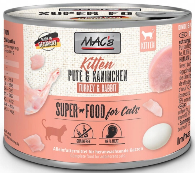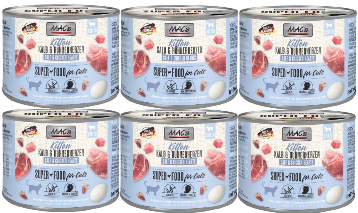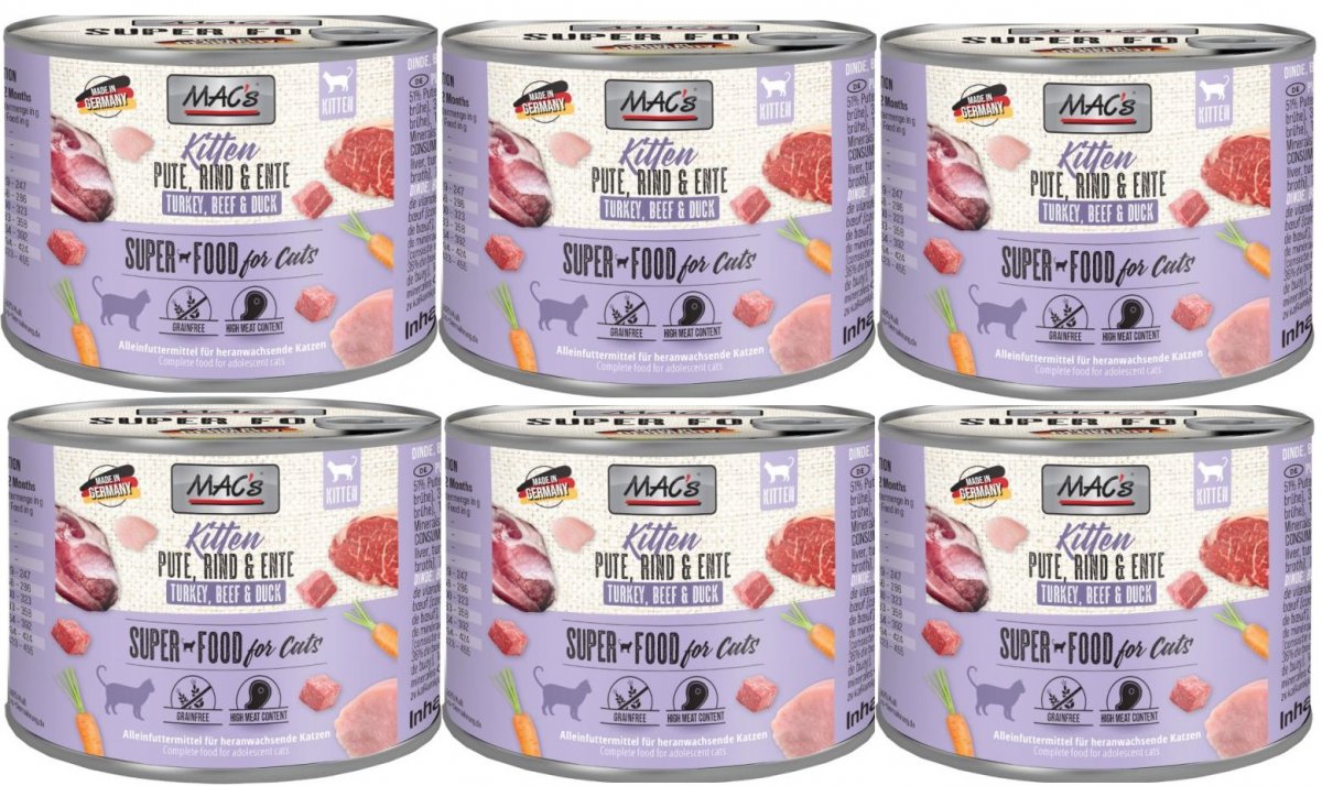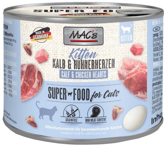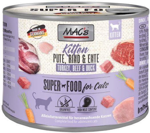 Karma mokra MAC´s Cat Kitten to wysokiej jakości pożywienie dla kota, które w szczególności nadaje się dla kotów o wrażliwym układzie pokarmowym. Przewód pokarmowy kota przyzwyczajony jest do diety opartej głównie na czystym mięsie. Karma zawierająca zboża często wywołuje nietolerancje pokarmowe u zwierząt. Z tego powodu, posiłki MAC's są całkowicie pozbawione zbóż i soi. Duża zawartość delikatnego mięsa zapewnia wyśmienity smak i wysoką akceptację. W karmie nie występują połączone kawałki mięsne, ani mączka kostna czy zwierzęca. Karma nie zawiera barwników, aromatów sztucznych i konserwantów. Dodatek tauryny przyczynia się do wzmocnienia funkcji serca i wzroku. Witaminy i minerały ponadto wzbogacają zrównoważoną dietę Twojego kota.