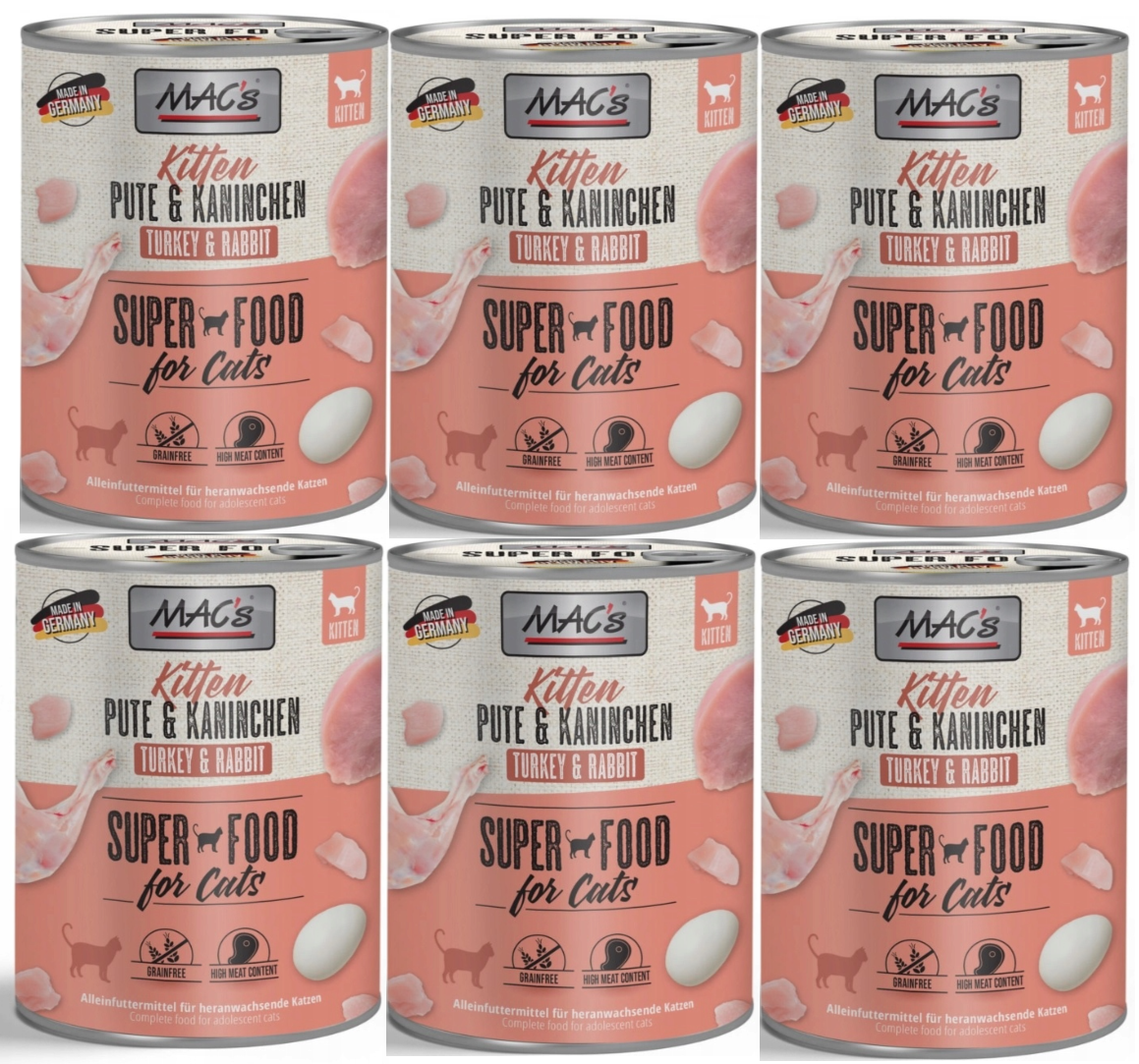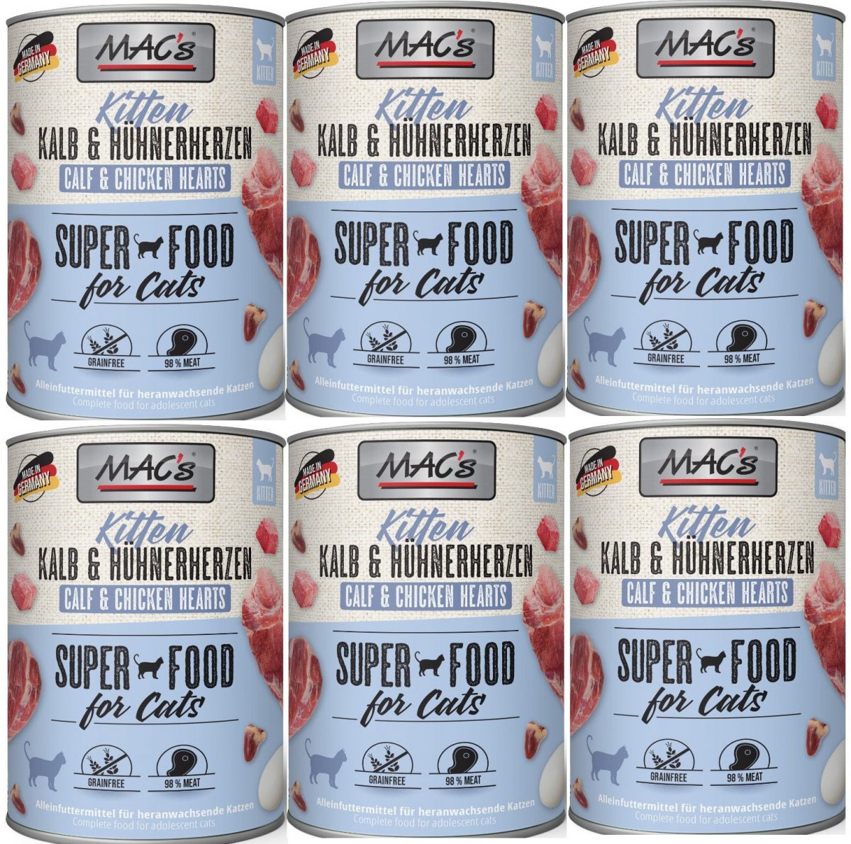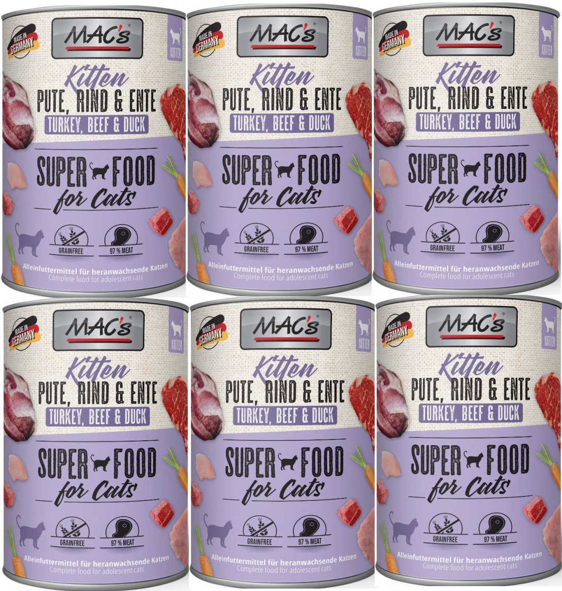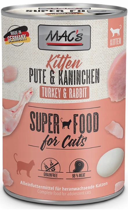 Karma mokra MAC´s Cat Kitten to wysokiej jakości pożywienie dla kota, które w szczególności nadaje się dla kotów o wrażliwym układzie pokarmowym. Przewód pokarmowy kota przyzwyczajony jest do diety opartej głównie na czystym mięsie. Karma zawierająca zboża często wywołuje nietolerancje pokarmowe u zwierząt. Z tego powodu, posiłki MAC's są całkowicie pozbawione zbóż i soi. Duża zawartość delikatnego mięsa zapewnia wyśmienity smak i wysoką akceptację. W karmie nie występują połączone kawałki mięsne, ani mączka kostna czy zwierzęca. Karma nie zawiera barwników, aromatów sztucznych i konserwantów. Dodatek tauryny przyczynia się do wzmocnienia funkcji serca i wzroku. Witaminy i minerały ponadto wzbogacają zrównoważoną dietę Twojego kota.