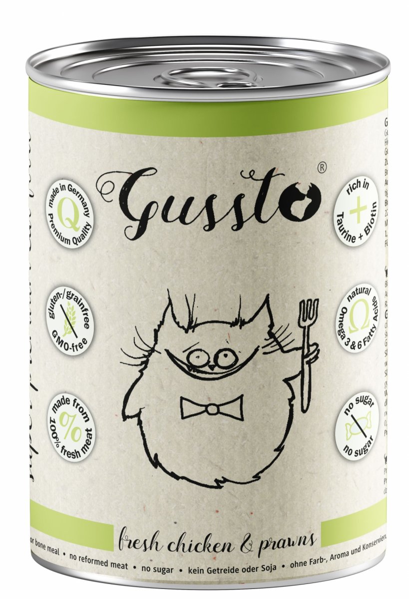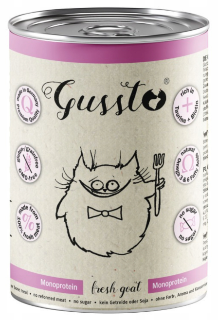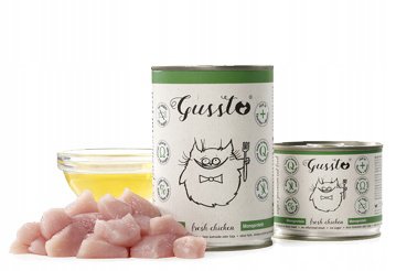 Produkowana jest w 100% z najwyższej jakości świeżego mięsa w wysokim standardzie odpowiadającym wymaganiom żywności dla ludzi. Gussto to esencja dobrego i zdrowego żywienia. Zawiera bardzo dużo mięsa idealnie odpowiadając specyficznym wymaganiom pokarmowym kotów. Jest to karma lekkostrawna i bardzo dobrze przyswajalna polecana również kotom o wrażliwym przewodzie pokarmowym. Stosowana także w dietach wykluczających przy alergiach pokarmowych. Znakomicie zrównoważony stosunek wapń/fosfor minimalizuje ryzyko chorób układu moczowego i nerek. Dodatkowo karma Gussto zawiera dużo niezbędnych witamin i minerałów jest bardzo bogata w Taurynę i Biotynę, a w jej skład wchodzi dobroczynny olej z ostropestu – bogaty w nienasycone kwasy tłuszczowe, który ma działanie przeciwzapalne, reguluje czynności trawienne i regeneracyjne wątroby, oraz wzmacnia system odpornościowy.