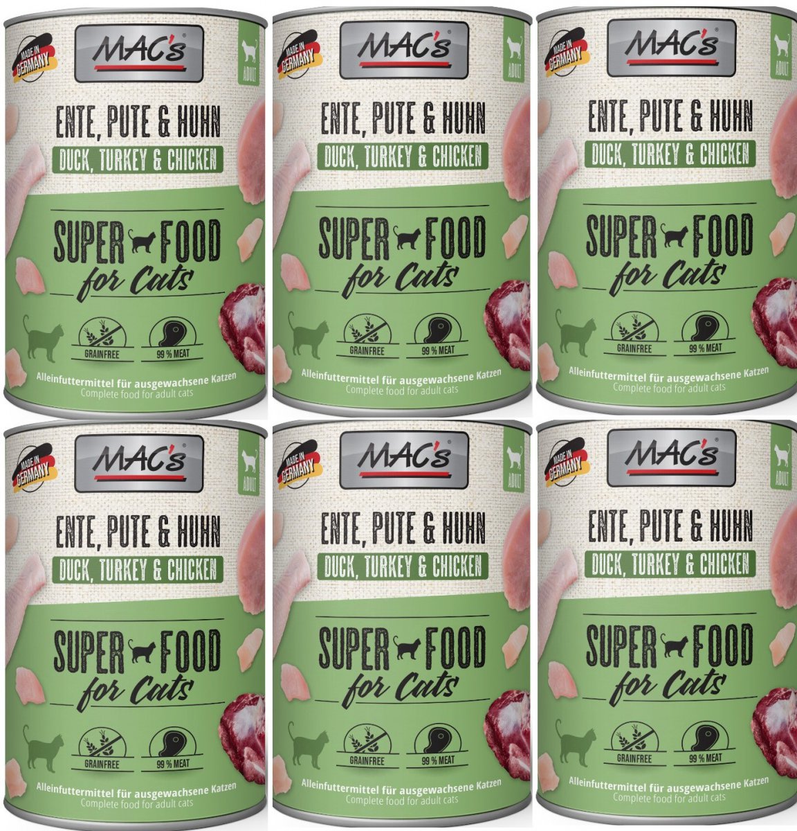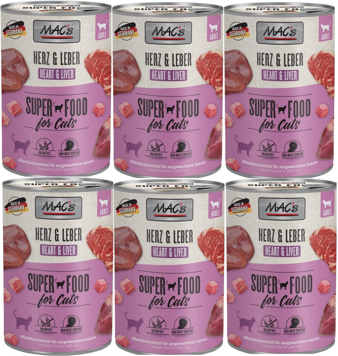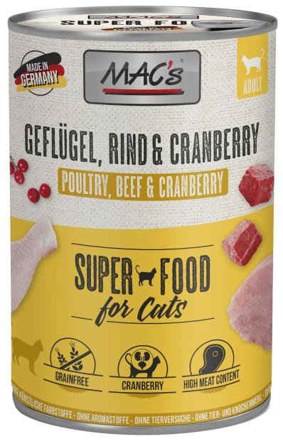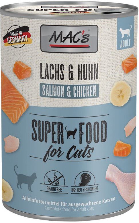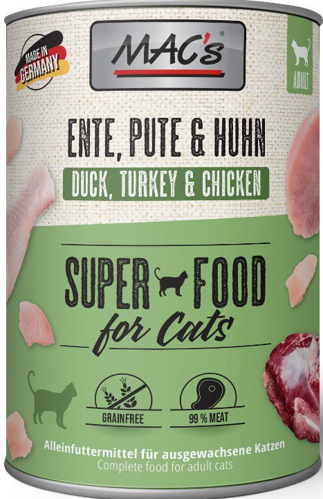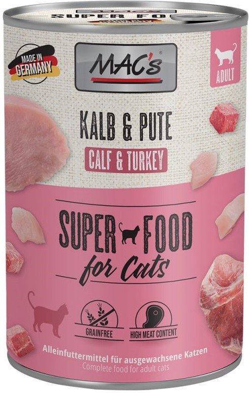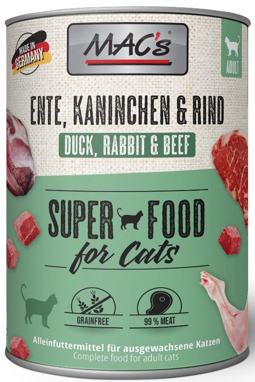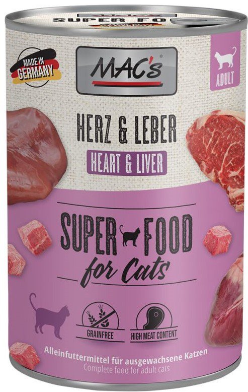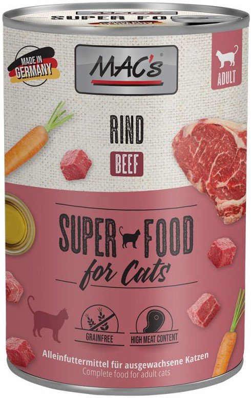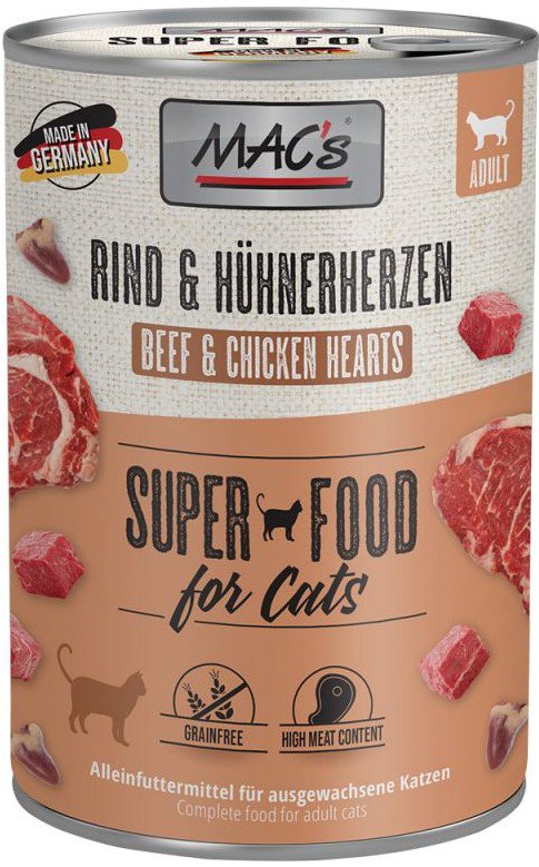 Karma mokra MAC´s Cat to wysokiej jakości pożywienie dla kota, które w szczególności nadaje się dla kotów o wrażliwym układzie pokarmowym. Przewód pokarmowy kota przyzwyczajony jest do diety opartej głównie na czystym mięsie. Karma zawierająca zboże często wywołuje nietolerancje pokarmowe u zwierząt. Z tego powodu, posiłki MAC's są całkowicie pozbawione zbóż i soi. Duża zawartość delikatnego mięsa zapewnia wyśmienity smak i wysoką akceptację. W karmie nie występują połączone kawałki mięsne, ani mączka kostna czy zwierzęca, jej wysoką jakość zapewnia najlepsze mięso z serc, wątroby czy płuc. Karma nie zawiera sztucznych barwników, aromatów, oraz konserwantów. Dodatek tauryny przyczynia się do wzmocnienia funkcji serca i wzroku. Witaminy i minerały ponadto wzbogacają zrównoważoną dietę Twojego kota.
