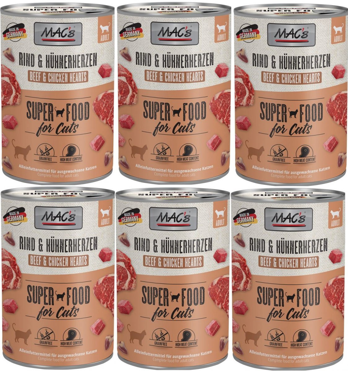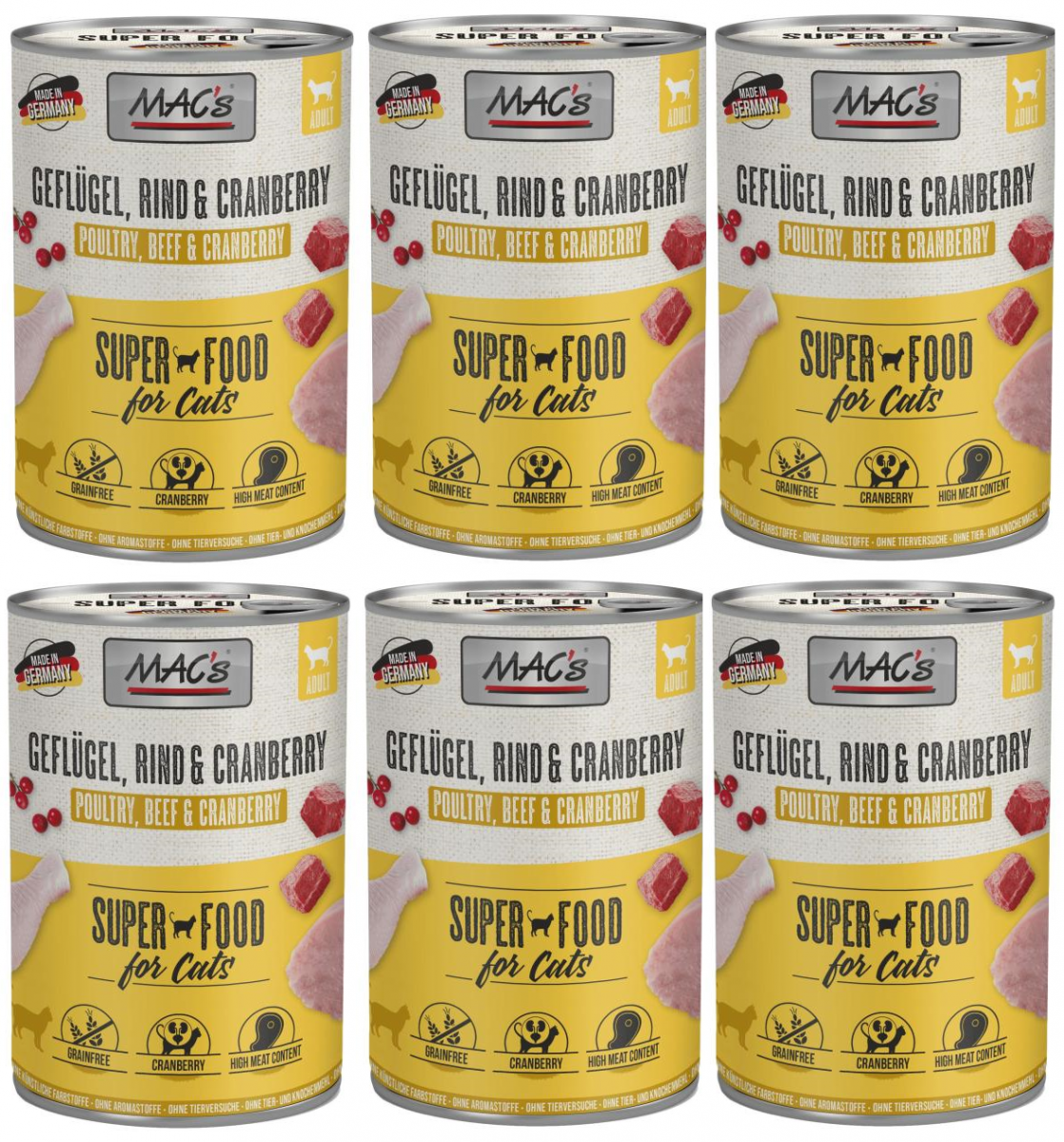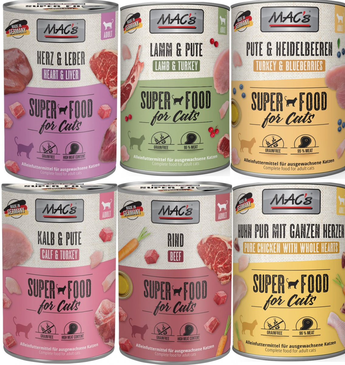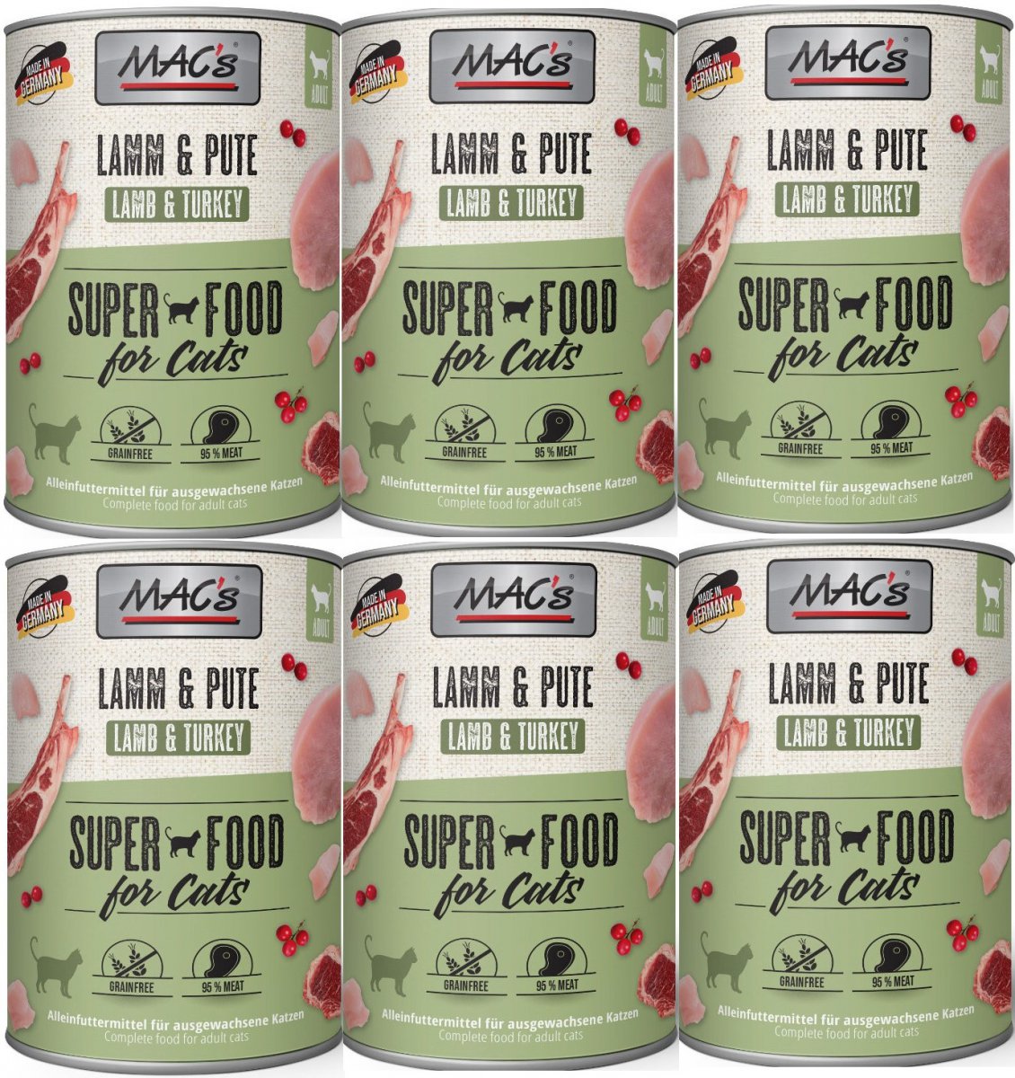 Karma mokra MAC´s Cat to wysokiej jakości pożywienie dla kota, które w szczególności nadaje się dla kotów o wrażliwym układzie pokarmowym. Przewód pokarmowy kota przyzwyczajony jest do diety opartej głównie na czystym mięsie. Karma zawierająca zboże często wywołuje nietolerancje pokarmowe u zwierząt. Z tego powodu, posiłki MAC's są całkowicie pozbawione zbóż i soi. Duża zawartość delikatnego mięsa zapewnia wyśmienity smak i wysoką akceptację. W karmie nie występują połączone kawałki mięsne, ani mączka kostna czy zwierzęca, jej wysoką jakość zapewnia najlepsze mięso z serc, wątroby czy płuc. Karma nie zawiera sztucznych barwników, aromatów, oraz konserwantów. Dodatek tauryny przyczynia się do wzmocnienia funkcji serca i wzroku. Witaminy i minerały ponadto wzbogacają zrównoważoną dietę Twojego kota.
