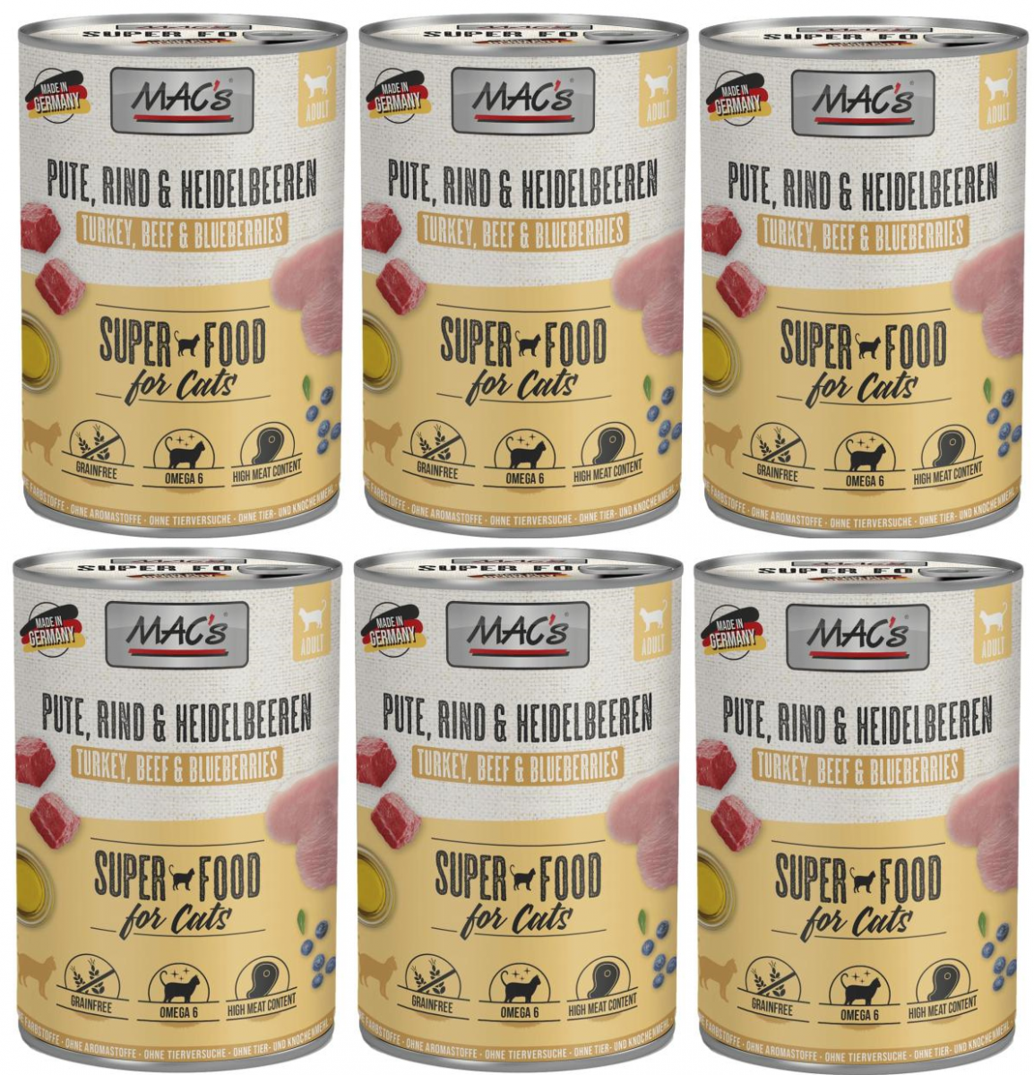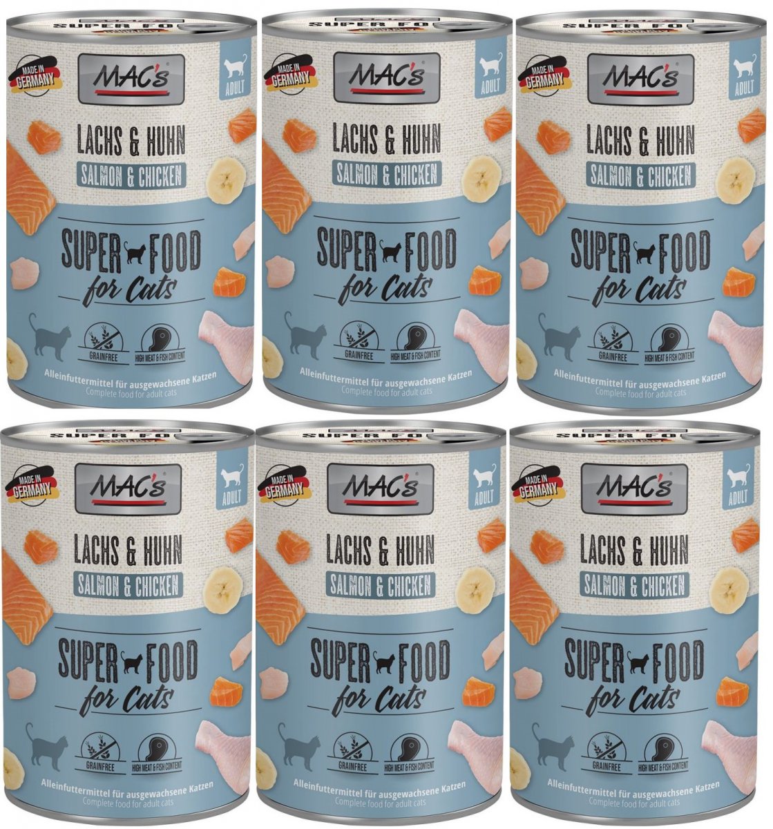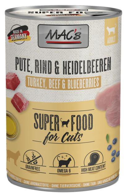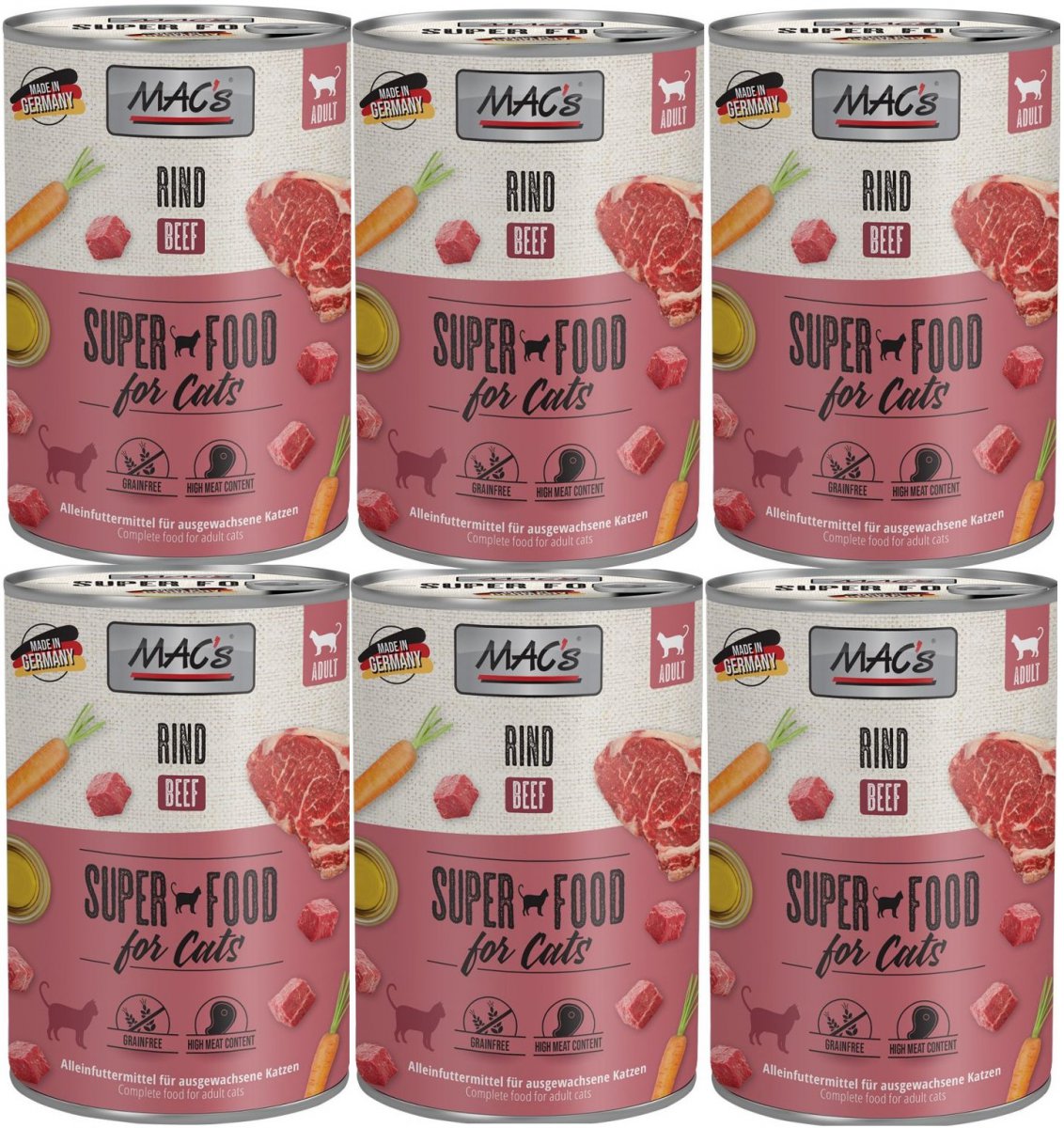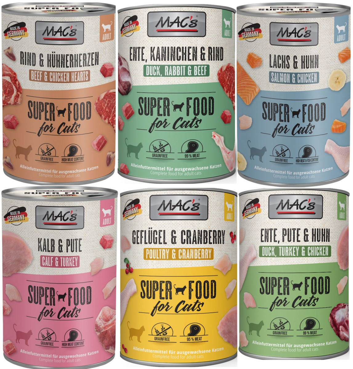 Karma mokra MAC´s Cat to wysokiej jakości pożywienie dla kota, które w szczególności nadaje się dla kotów o wrażliwym układzie pokarmowym. Przewód pokarmowy kota przyzwyczajony jest do diety opartej głównie na czystym mięsie. Karma zawierająca zboże często wywołuje nietolerancje pokarmowe u zwierząt. Z tego powodu, posiłki MAC's są całkowicie pozbawione zbóż i soi. Duża zawartość delikatnego mięsa zapewnia wyśmienity smak i wysoką akceptację. W karmie nie występują połączone kawałki mięsne, ani mączka kostna czy zwierzęca, jej wysoką jakość zapewnia najlepsze mięso z serc, wątroby czy płuc. Karma nie zawiera sztucznych barwników, aromatów, oraz konserwantów. Dodatek tauryny przyczynia się do wzmocnienia funkcji serca i wzroku. Witaminy i minerały ponadto wzbogacają zrównoważoną dietę Twojego kota.