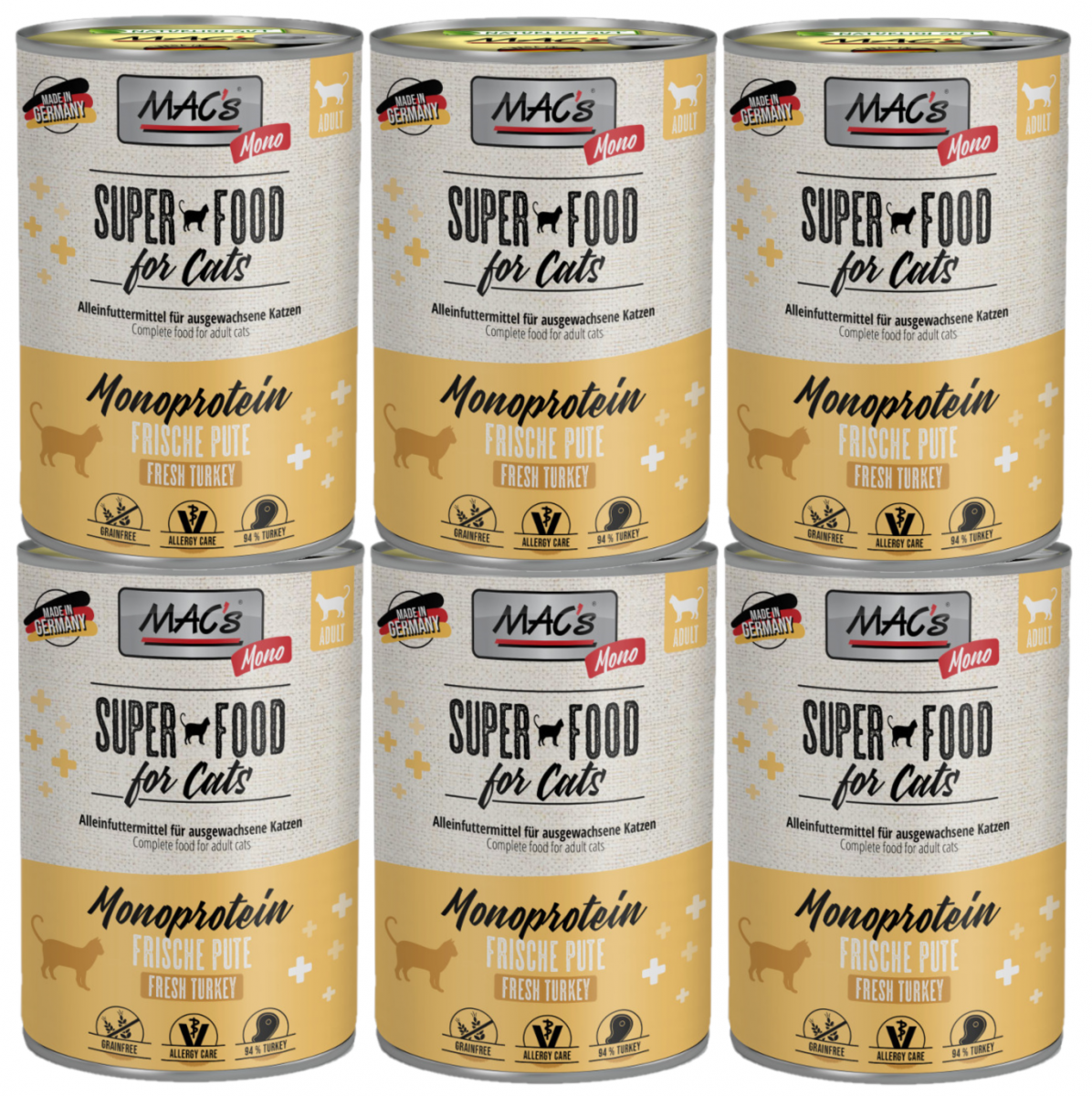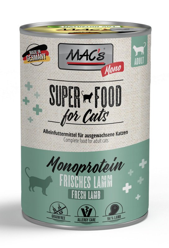 MAC´s Cat Mono jest karmą mokrą, która dzięki wyjątkowej recepturze jest odpowiednia dla kotów o wrażliwym żołądku. Wiele kotów reaguje alergicznie po spożyciu nie tylko zboża, ale także danego rodzaju mięsa, dlatego karma MAC's MONO zawiera tylko jeden rodzaj mięsa, żeby uniknąć takich sytuacji. W karmie MAC's nie występują połączone kawałki mięsne, ani mączka kostna czy zwierzęca. Zamiast zbóż, karma zawiera tylko lekkostrawne marchewki, które nie obciążają dodatkowo układu pokarmowego. Dzięki delikatnemu procesowi przygotowania bez dodatku barwników, aromatów sztucznych i konserwantów, karmy MAC's są naturalną przyjemnością dla kotów. Dodatek tauryny przyczynia się do wzmocnienia funkcji serca i wzroku. Witaminy i minerały ponadto wzbogacają zrównoważoną dietę Twojego kota.