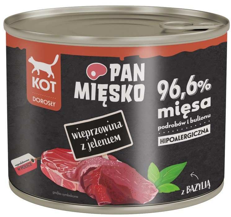 Wysokomięsne karmy mokre dla kotów Pan Mięsko. Wyróżniają je starannie wyselekcjonowane mięsa z dodatkiem soczystych polskich jabłek i cennych dodatków, jak zioła, czy nasiona, które pozytywnie wpłyną na zdrowie oraz kondycję Twojego kota. Nasze receptury zostały przygotowane przez specjalistów, po to, aby dostarczyć Twojemu czworonożnemu towarzyszowi dokładnie to, czego potrzebuje.