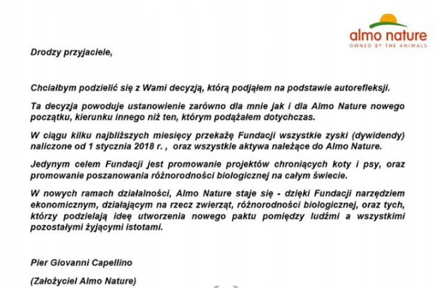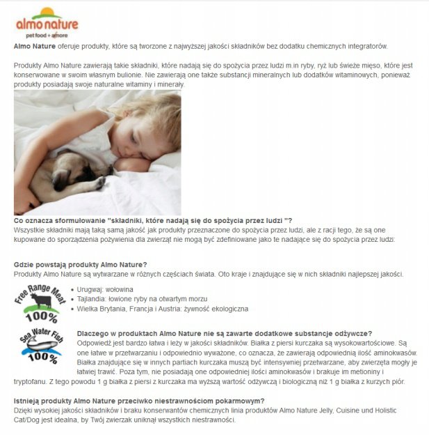 Almo Nature dba o zdrowie zwierząt od 2000 roku, w którym powstała. Karma ta jako pierwsza na świecie rozpoczęła produkcję żywności dla zwierząt bez sztucznych dodatków, za to z dużą zawartością świeżego mięsa. Produkty Almo Nature tworzone są aby dbać o dobrostan zwierząt dostarczając im nie tylko smaczne ale również zdrowe pokarmy zarówno w formie karmy mokrej jak i suchej. Odpowiednio wyselekcjonowane składniki cechuje wysoka wartość biologiczna oraz odżywcza. Karmy nie są poddawane procesowi przetwarzania dzięki czemu są zgodne z naturalnym żywieniem psów i kotów.