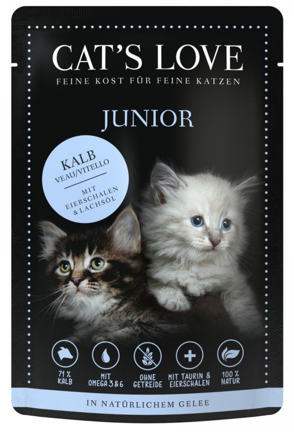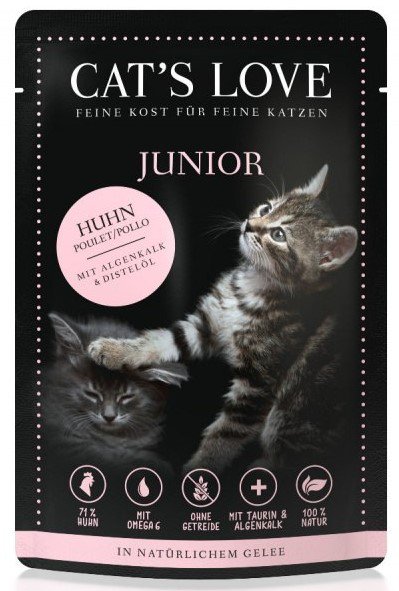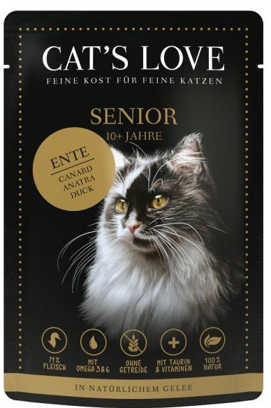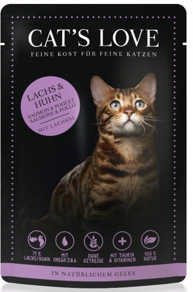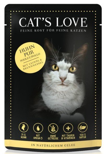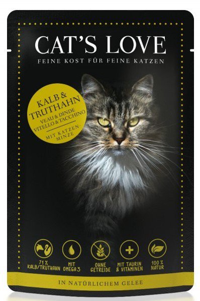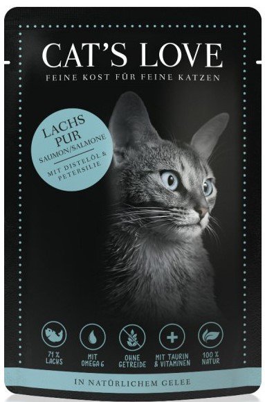 - Z kwasami omega 3 i 6 - karmy Cat's Love zawierają idealną proporcję niezbędnych kwasów tłuszczowych, które zapewniają kotu zdrową i lśniącą sierść.