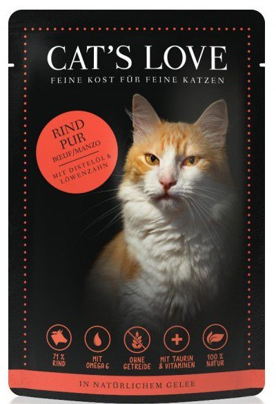 - Wysoka zawartość mięsa - Cat's Love oferuje Twojemu kotu dokładnie to, czego potrzebuje z natury: niezbędne do życia białko w najbardziej naturalnej formie z mięsa.