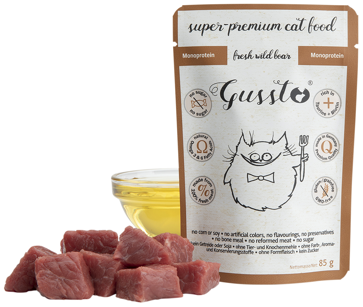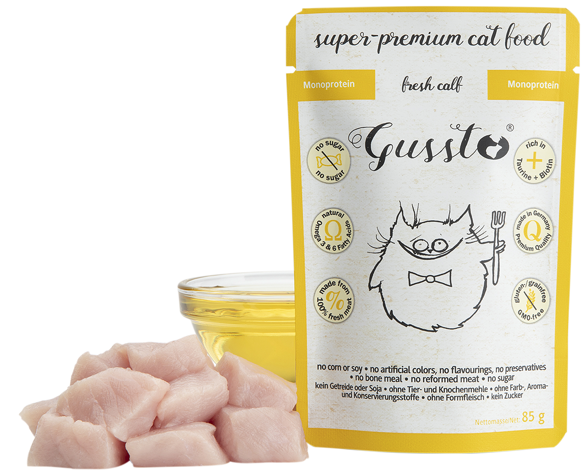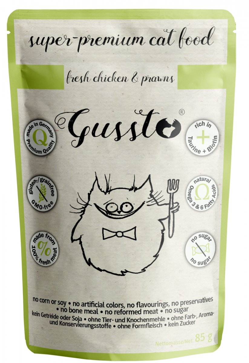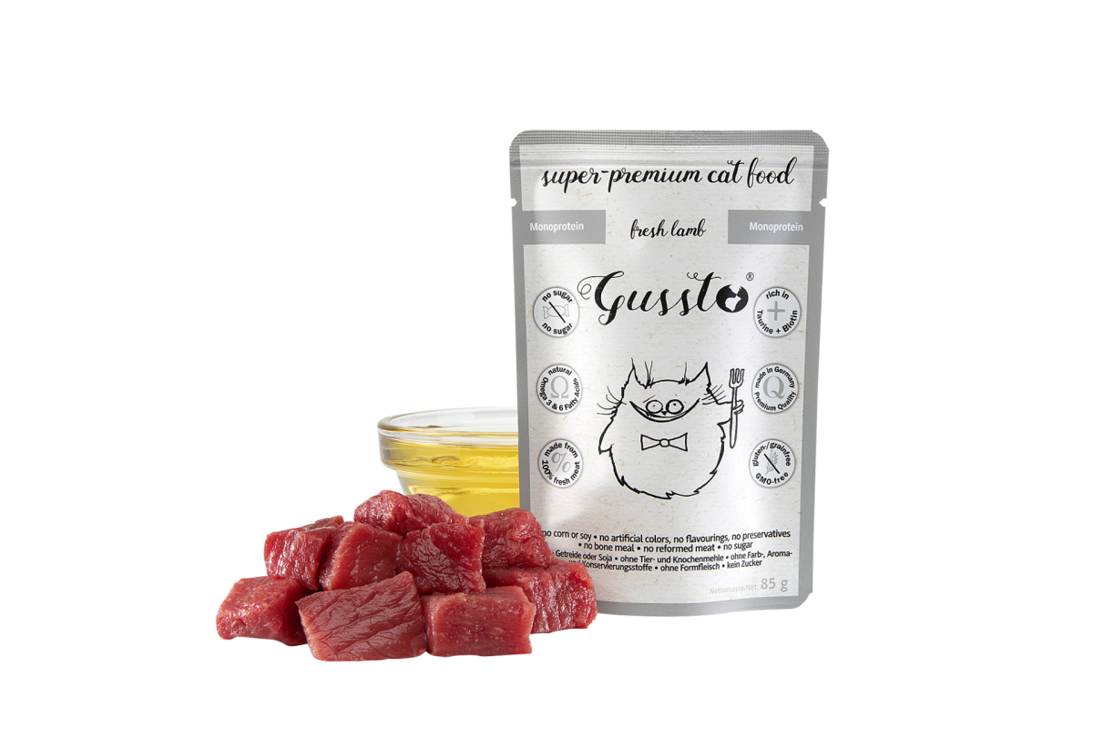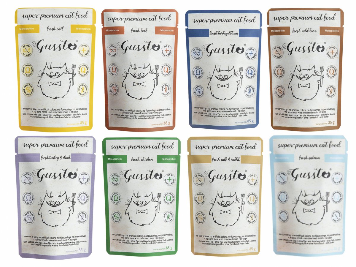 Produkowana jest w 100% z najwyższej jakości świeżego mięsa w wysokim standardzie odpowiadającym wymaganiom żywności dla ludzi. Gussto to esencja dobrego i zdrowego żywienia. Zawiera bardzo dużo mięsa idealnie odpowiadając specyficznym wymaganiom pokarmowym kotów. Jest to karma lekkostrawna i bardzo dobrze przyswajalna polecana również kotom o wrażliwym przewodzie pokarmowym. Stosowana także w dietach wykluczających przy alergiach pokarmowych. Znakomicie zrównoważony stosunek wapń/fosfor minimalizuje ryzyko chorób układu moczowego i nerek. Dodatkowo karma Gussto zawiera dużo niezbędnych witamin i minerałów jest bardzo bogata w Taurynę i Biotynę, a w jej skład wchodzi dobroczynny olej z ostropestu – bogaty w nienasycone kwasy tłuszczowe, który ma działanie przeciwzapalne, reguluje czynności trawienne i regeneracyjne wątroby, oraz wzmacnia system odpornościowy.