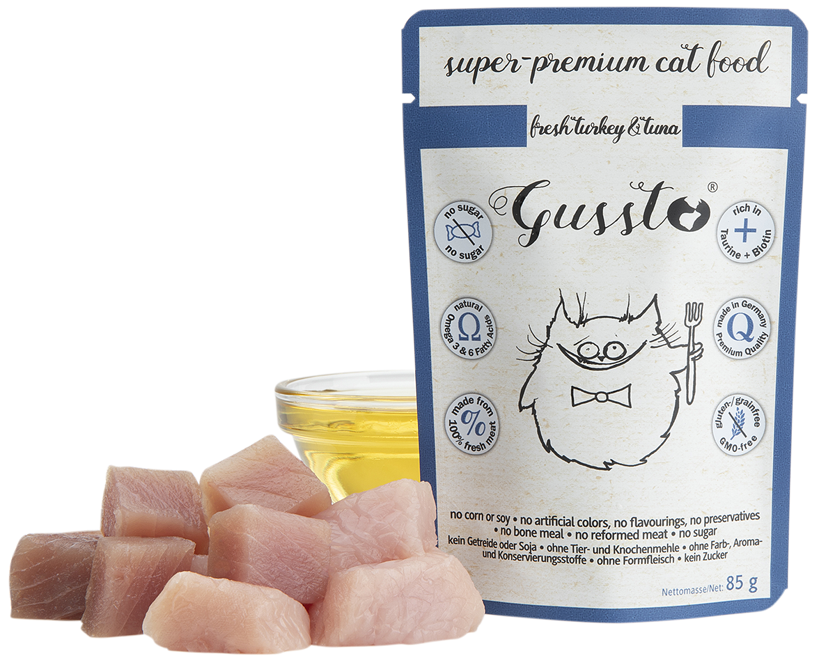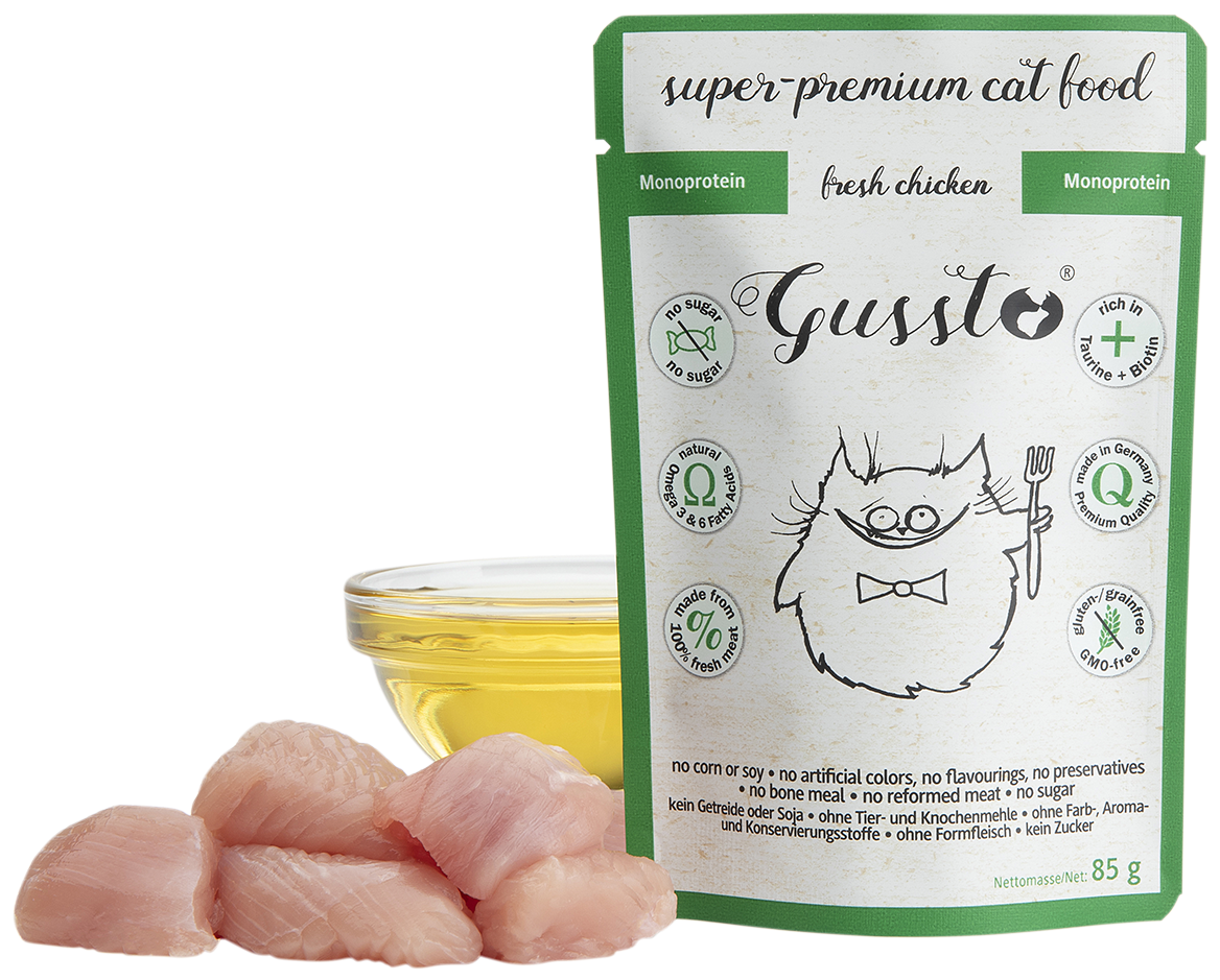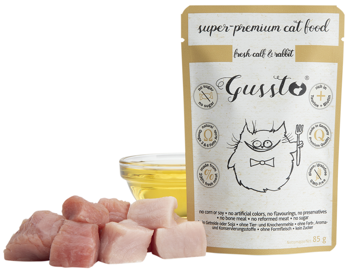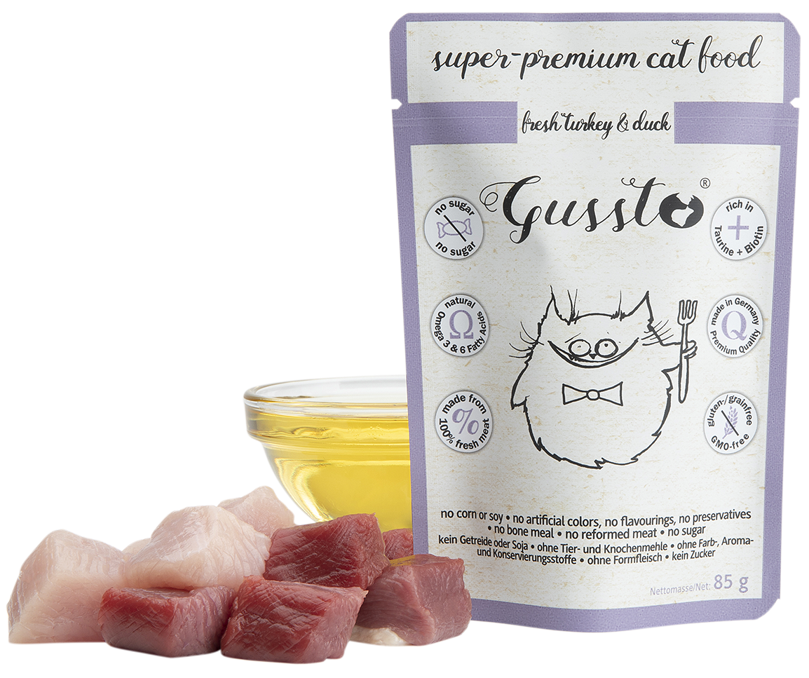 Produkowana jest w 100% z najwyższej jakości świeżego mięsa w wysokim standardzie odpowiadającym wymaganiom żywności dla ludzi. Gussto to esencja dobrego i zdrowego żywienia. Zawiera bardzo dużo mięsa idealnie odpowiadając specyficznym wymaganiom pokarmowym kotów. Jest to karma lekkostrawna i bardzo dobrze przyswajalna polecana również kotom o wrażliwym przewodzie pokarmowym. Stosowana także w dietach wykluczających przy alergiach pokarmowych. Znakomicie zrównoważony stosunek wapń/fosfor minimalizuje ryzyko chorób układu moczowego i nerek. Dodatkowo karma Gussto zawiera dużo niezbędnych witamin i minerałów jest bardzo bogata w Taurynę i Biotynę, a w jej skład wchodzi dobroczynny olej z ostropestu – bogaty w nienasycone kwasy tłuszczowe, który ma działanie przeciwzapalne, reguluje czynności trawienne i regeneracyjne wątroby, oraz wzmacnia system odpornościowy.