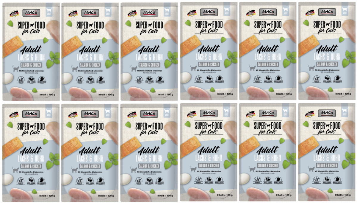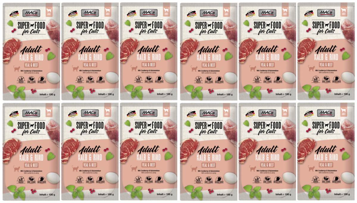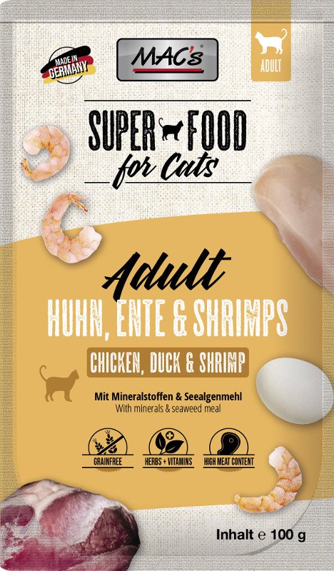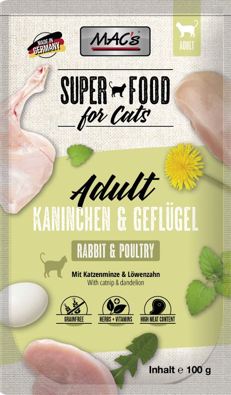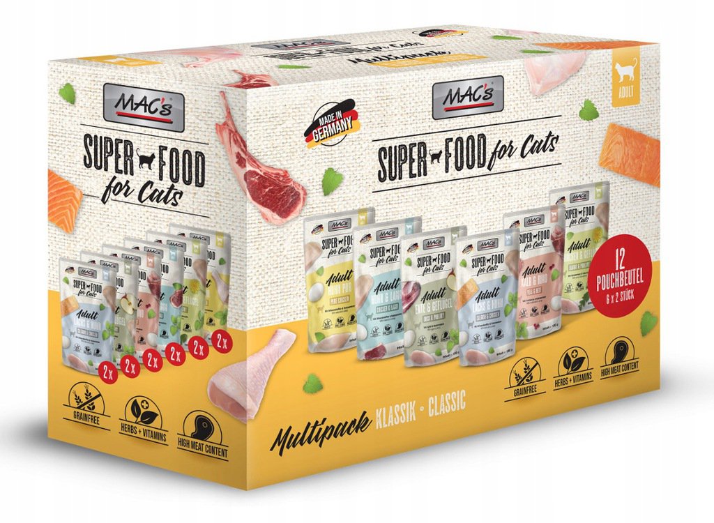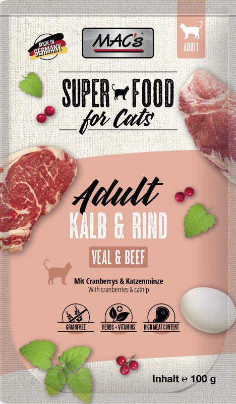 Karma mokra MAC´s Cat to wysokiej jakości pożywienie dla kota, które w szczególności nadaje się dla kotów o wrażliwym układzie pokarmowym. Przewód pokarmowy kota przyzwyczajony jest do diety opartej głównie na czystym mięsie. Karma zawierająca zboże często wywołuje nietolerancje pokarmowe u zwierząt. Z tego powodu, posiłki MAC's są całkowicie pozbawione zbóż i soi. Duża zawartość delikatnego mięsa (70%) zapewnia wyśmienity smak i wysoką akceptację. W karmie nie występują połączone kawałki mięsne, ani mączka kostna czy zwierzęca, jej wysoką jakość zapewnia najlepsze mięso z serc, wątroby czy płuc. Karma nie zawiera sztucznych barwników, aromatów, oraz konserwantów. Dodatek tauryny przyczynia się do wzmocnienia funkcji serca i wzroku. Witaminy i minerały ponadto wzbogacają zrównoważoną dietę Twojego kota.