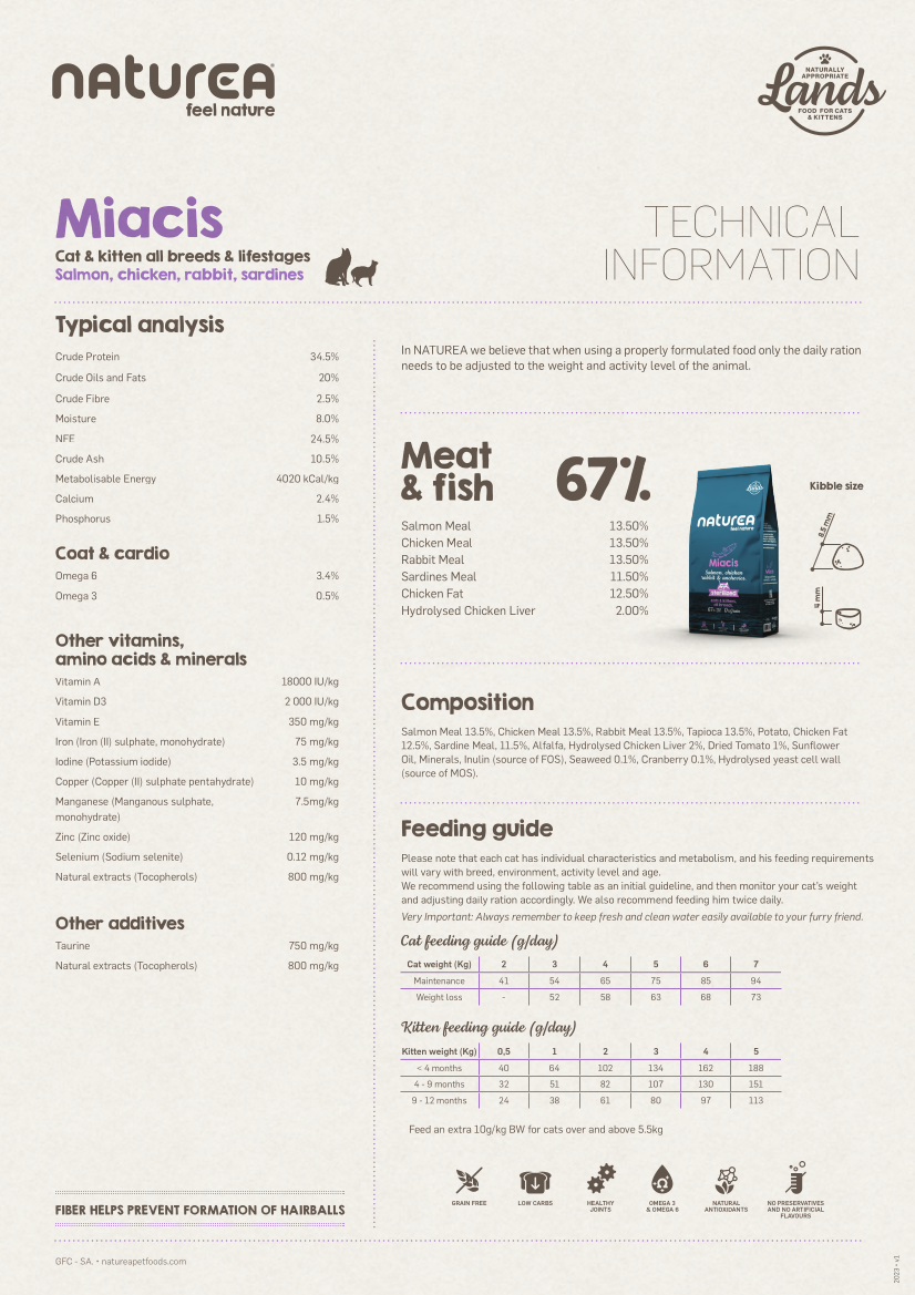 Sucha karma Naturea Grain Free Lands jest ściśle zgodna z koncepcją Naturalnie odpowiedniej żywności dla kotów i kociąt, a jej skład opiera się na tym, czego naprawdę potrzebują nasze koty. Receptura opracowana przez lekarzy weterynarii i dietetyków tak, aby jak najlepiej zaspokoić wszystkie potrzeby biologiczne naszych kotów. Głównymi składnikami naszych karm jest zawsze mięso lub ryby, uzupełnione słodkimi ziemniakami, owocami, warzywami, aromatycznymi ziołami i wodorostami, które mają niską zawartość węglowodanów.