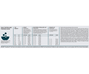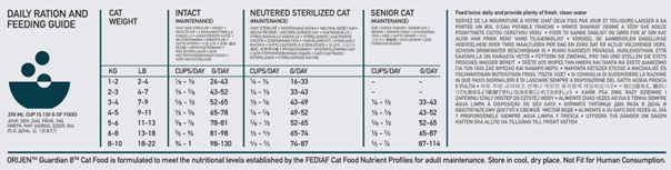 Energia Metaboliczna: 4120 kcal/kg (535 kcal na kubek 250 ml), która zapewnia optymalną kondycję; 39% energii pochodzi z białka, 17% z warzyw i owoców, a 44% z tłuszczów.
