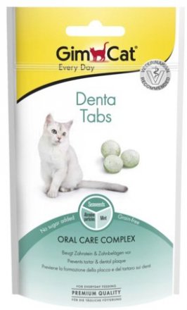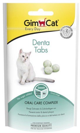 GimCat Denta Tabs to zdrowe przysmaki dla kota, zawierające cenne substancje ścierne z celulozy, które wspomagają ścieranie płytki nazębnej. Heksametafosforan sodu i wodorosty zapobiegają tworzeniu się kamienia nazębnego, a mięta zapewnia świeży oddech.