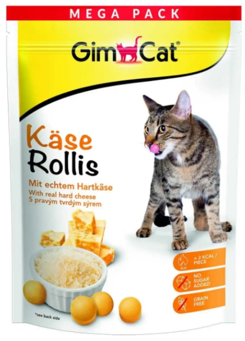GimCat Käse-Rollis (Cheezies) to pyszne przekąski uszlachetnione prawdziwym serem. Zostały wyprodukowane z najlepszych składników i bez dodatku cukru. Oprócz bardzo dobrego smaku Käse-Rollis (Cheezies), mają również pozytywny wpływ na zachowanie kota podczas zabawy. Idealne połączenie przyjemności i zabawy.