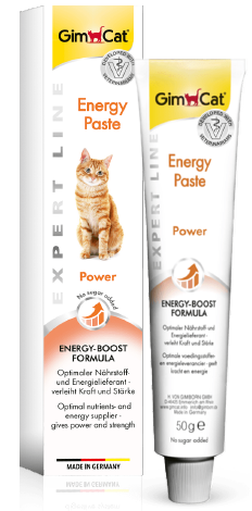Pasta GimCat Energy zawiera wysoko skoncentrowaną energię pod postacią wysokiej jakości olejów oraz ważnych składników pokarmowych. Należą do nich między innymi niezbędne do prawidłowego funkcjonowania witaminy, określone pierwiastki śladowe oraz składniki mineralne. Zawarta w paście formuła "Energy-Boost-Formula" daję kotu moc i siłę poprzez wspieranie organizmu przez: