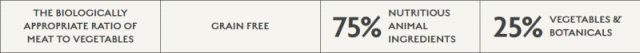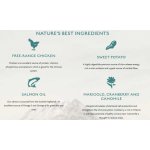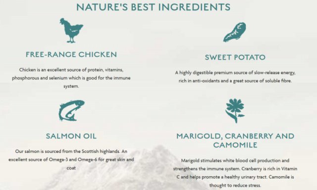 Skład: Świeże mięso bez kości z kurcząt z wolnego wybiegu (23%), suszony kurczak (18%), świeże mięso z łososia bez ości (16%), bataty, suszony łosoś (10%), ziemniaki, suszone jajka (3%), tłuszcz z kurczaka (2%), wywar z kurczaka (2%), lucerna, olej z łososia (1%), minerały, witaminy, żurawina, jabłko, marchewka, szpinak, wodorosty, fruktooligosacharydy, glukozamina (350 mg/kg), siarczan chondroityny (240 mg/kg), mannooligosacharydy, rumianek, mięta pieprzowa, nagietek, anyż, kozieradka pospolita.