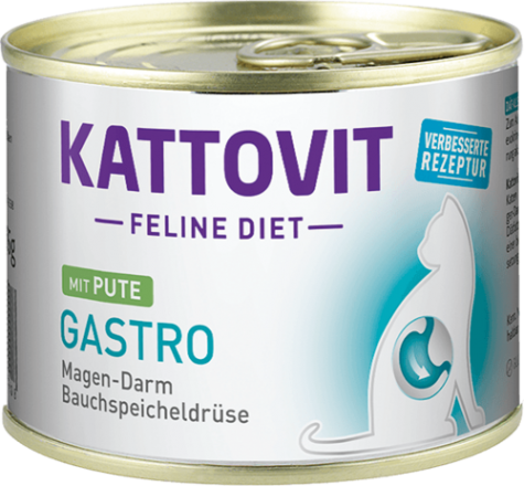 Karma mokra Kattovit Gastro w puszkach to specjalna dieta dla kotów cierpiących na schorzenia układu pokarmowego. Choroby te mogą mieć różne objawy, np. wymioty, zaburzenia trawienne, biegunki lub zaparcia. Aby nie obciążać dodatkowo układu pokarmowego, w skład karmy wchodzą lekkostrawne białka, dostarczające odpowiednią ilość energii. Zredukowana zawartość włókien surowych i niska zawartość tłuszczu pomagają odciążyć układ trawienny. Dzięki temu karmę można podawać również osłabionym kotom w okresie rekonwalescencji po operacjach. Aby wyrównać niedobór składników mineralnych i soli spowodowany dużą utratą płynów karma zawiera zwiększoną ilość elektrolitów. Egzogenna tauryna i inne ważne witaminy i składniki mineralne zapewniają kotu zbilansowany profil odżywczy i dostarczają do jego organizmu wszystkie substancje, jakich potrzebuje.