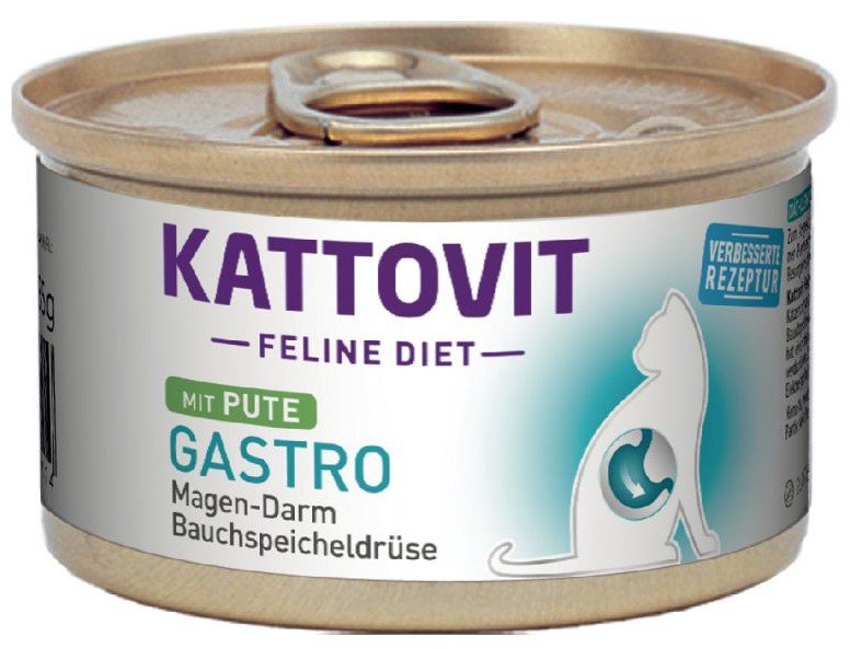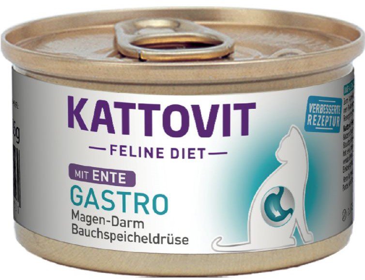 Karma mokra Kattovit Gastro w puszkach to specjalna dieta dla kotów cierpiących na schorzenia układu pokarmowego. Choroby te mogą mieć różne objawy, np. wymioty, zaburzenia trawienne, biegunki lub zaparcia. Aby nie obciążać dodatkowo układu pokarmowego, w skład karmy wchodzą lekkostrawne białka, dostarczające odpowiednią ilość energii. Zredukowana zawartość włókien surowych i niska zawartość tłuszczu pomagają odciążyć układ trawienny. Dzięki temu karmę można podawać również osłabionym kotom w okresie rekonwalescencji po operacjach. Aby wyrównać niedobór składników mineralnych i soli spowodowany dużą utratą płynów karma zawiera zwiększoną ilość elektrolitów. Egzogenna tauryna i inne ważne witaminy i składniki mineralne zapewniają kotu zbilansowany profil odżywczy i dostarczają do jego organizmu wszystkie substancje, jakich potrzebuje.