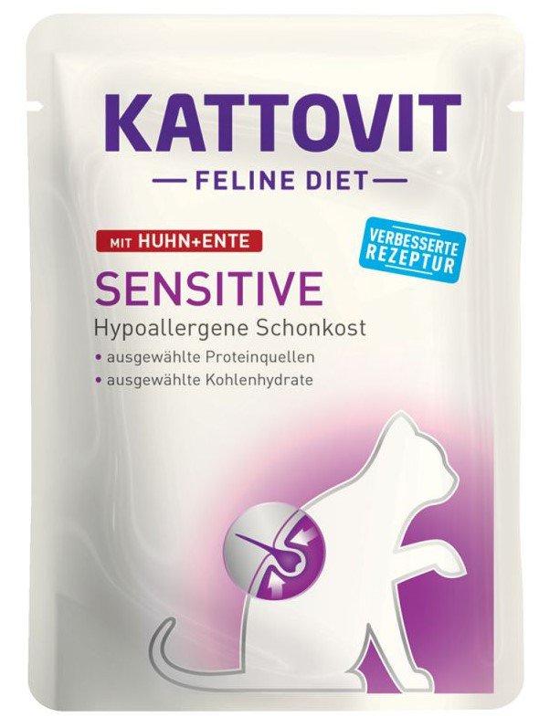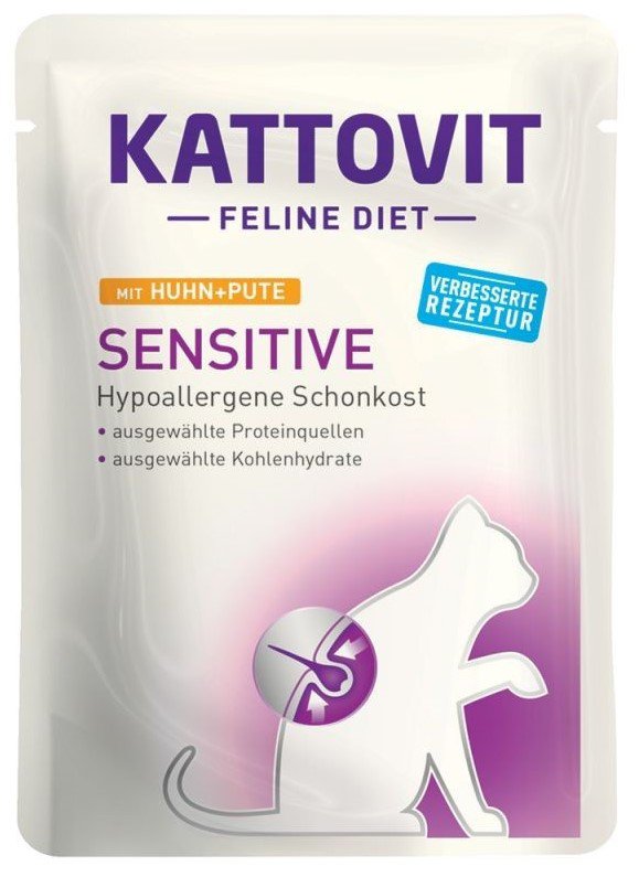 KATTOVIT FELINE DIET SENSITIVE, Hypoallergene Schonkost to pełnoporcjowy pokarm DIETETYCZNY dla kotów z nietolerancją trawienną (alergią) wobec składników odżywczych (dla kotów z problemami z sierścią i skórą).