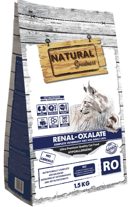 Natural Greatness Renal - Oxalate to kompletna, pozbawiona zbóż, hipoalergiczna lecznicza karma dla dorosłych kotów, u których występuje przewlekła choroba nerek. Karma ta pomaga zachować prawidłowe działanie nerek i zapobiega ponownemu pojawianiu się kamieni szczawianowych poprzez alkalizację moczu oraz zredukowanie poziomu wapnia i witaminy D. Pełnowartościowe białko wpływa pozytywnie na procesy trawienne. Dodatkowo, dzięki niskiej zawartości sodu, dieta ta usprawnia funkcjonowanie układu moczowego oraz sercowego, w przypadku wystąpienia przewlekłych wad serca.