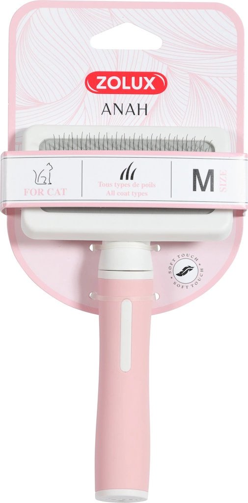 Gama produktów Anah pomaga w higienie i pielęgnacji sierści kota. Specjalnie zaprojektowany ergonomiczny uchwyt sprawia, że szczotka dobrze leży w dłoni. Szczotka posiada specjalne miękkie i przyjemne w dotyku wykończenie typu Soft Touch. Uchwyt posiada jeden rozmiar bez względu na wielkość szczotki.