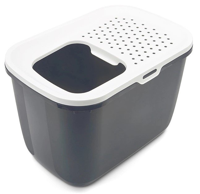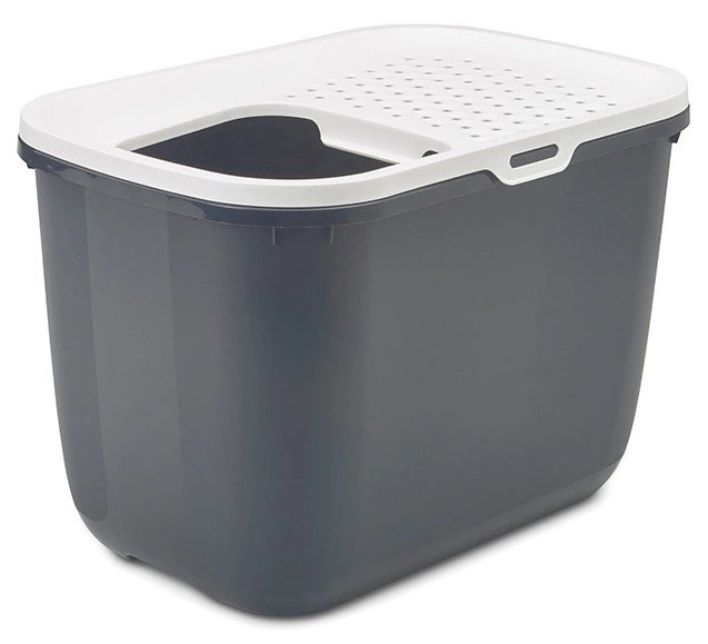 Kuweta Hop In to nowoczesna toaleta z wejściem od góry. Kuweta "wskakuj do środka" jest bardzo polecana dla kotów, które nie kucają podczas siusiania, siusiają do tyłu lub nagminnie rozrzucają żwirek podczas wyskakiwania, ponieważ wysokie ściany zatrzymują płyny i brud wewnątrz kuwety. Ponadto, kuweta jest również idealna dla „posiadaczy kotów i psów”, ponieważ żwirek i odchody są utrzymywane poza zasięgiem psa i uniemożliwiają mu wejście do toalety.