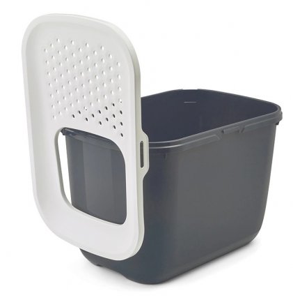 Codzienne użytkowanie kuwety jest niezwykle łatwe i przyjemne. Górna pokrywa może być zawieszona na krawędzi na czas czyszczenia, a wyprofilowane uchwyty na spodzie pozwalają na jej łatwe przenoszenie i opróżnianie. Dodatkowo, kuweta została wyposażona w poręczny haczyk, na którym można zawiesić łopatkę, kiedy nie jest używana.