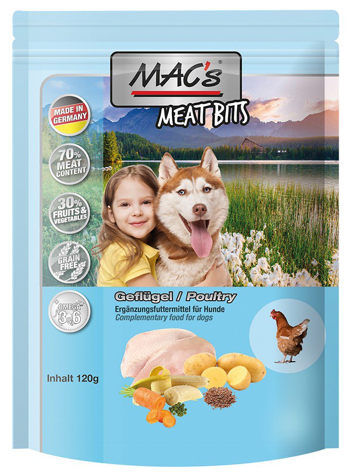 MAC’s Meat Bit to bardzo smakowity, bezzbożowy przysmak dla psa, który zawiera 70% mięsa i 30% warzyw i owoców. W trosce o piękną oraz zdrową sierść i skórę Twojego Pupila receptura smaczków została wzbogacona o kwasy OMEGA 3 i 6.