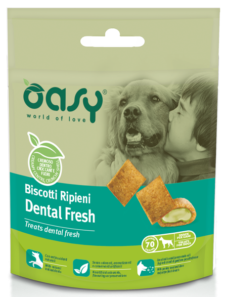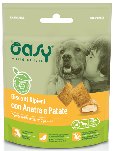 Oasy chrupiące ciasteczka dla psa z pysznym nadzieniem. Chrupiące na zewnątrz, kremowe w środku. Nie zawierają sztucznych barwników, aromatów ani konserwantów.