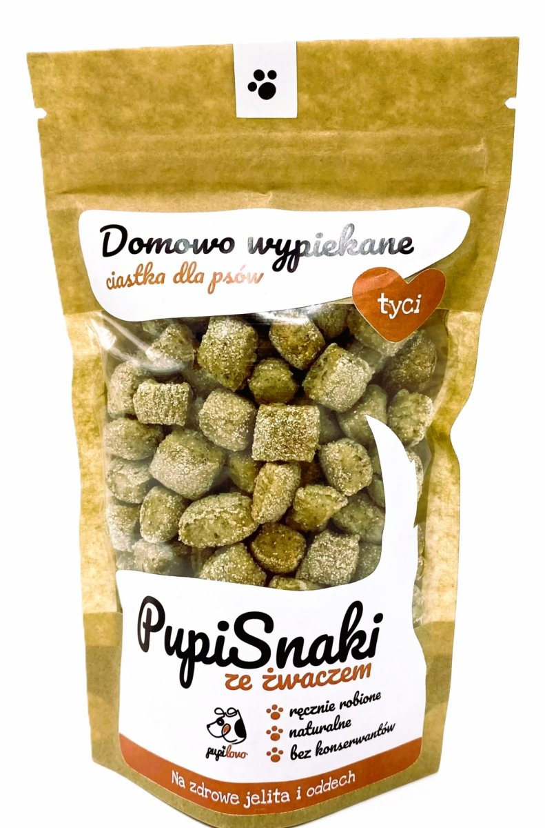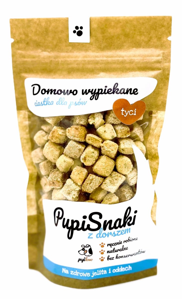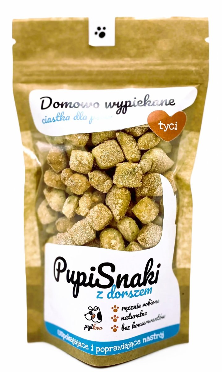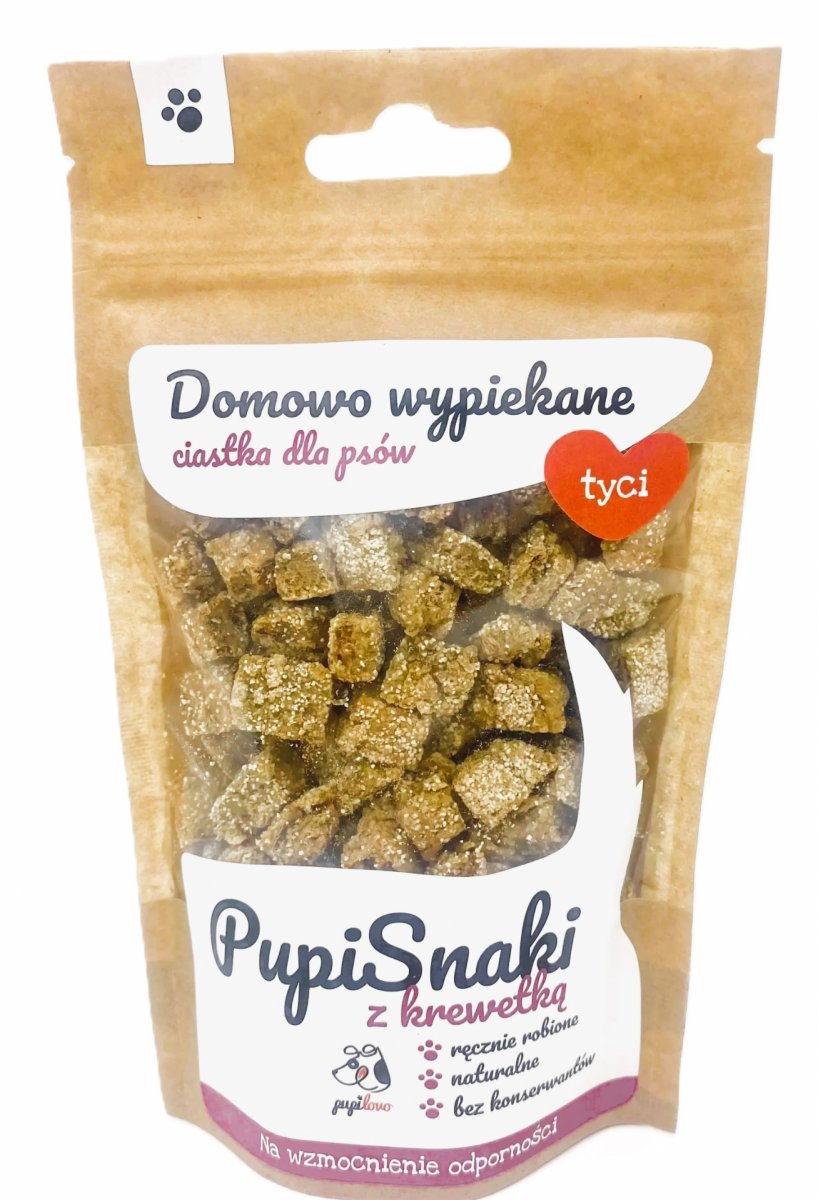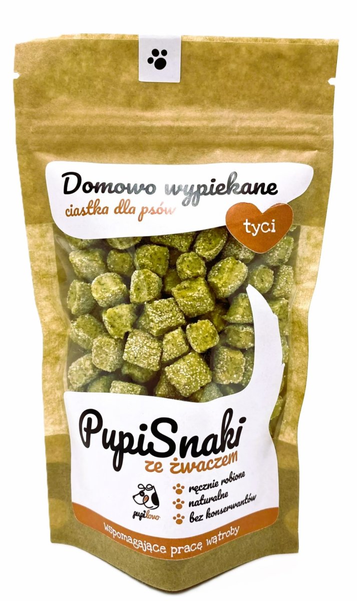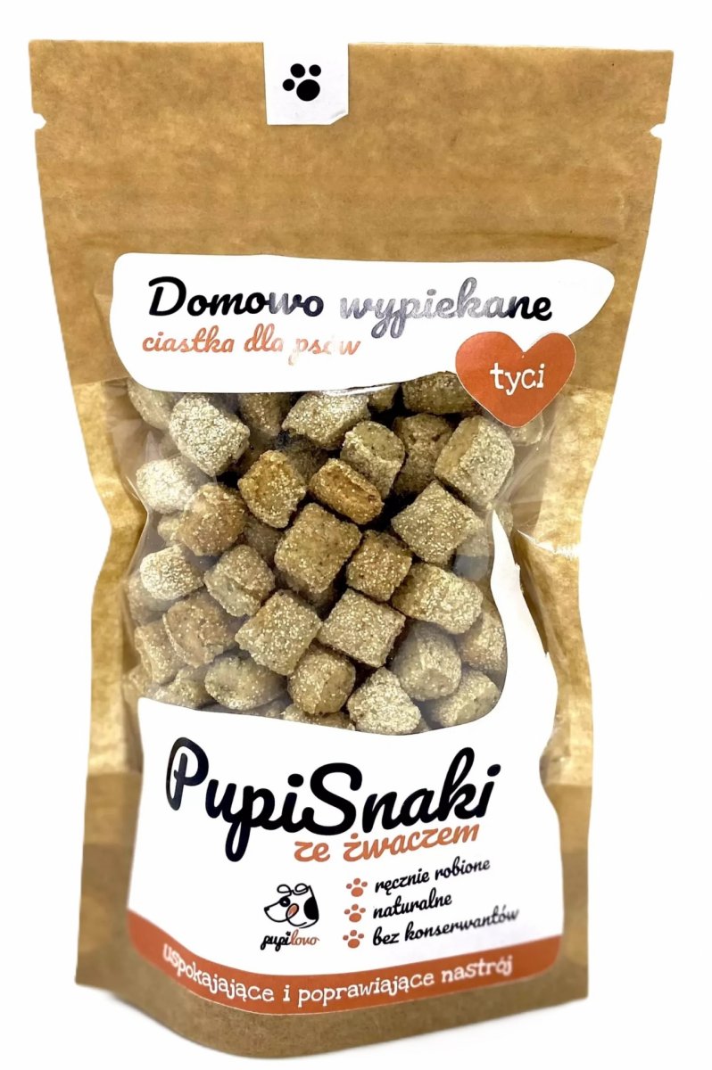 PUPISnaki Tyci to ręcznie wypiekane, naturalne ciasteczka stworzone specjalnie z myślą o małych rasach i szczeniętach. Ich kompaktowy rozmiar i delikatny skład sprawiają, że są lekkostrawne, bezpieczne i odpowiednie nawet dla wrażliwych brzuszków.