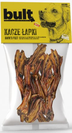 Kacze łapki od firmy BULT to gryzaki o idealnej wilgotności, co wpływa na pozytywne walory smakowe oraz zapewnia dłuższą przydatność do spożycia. Dzięki procesowi powolnego suszenia, właściwemu nasyceniu wysoko przyswajalnymi białkami oraz minerałami, możesz mieć pewność, że dostarczasz psu mikroelementy niezbędne do prawidłowego rozwoju. Kacze łapki, ze względu na specyfikę budowy przeznaczone są przede wszystkim dla psów średnich i dużych. Ten gryzak stanowi idealne uzupełnienie diety Twojego pupila.