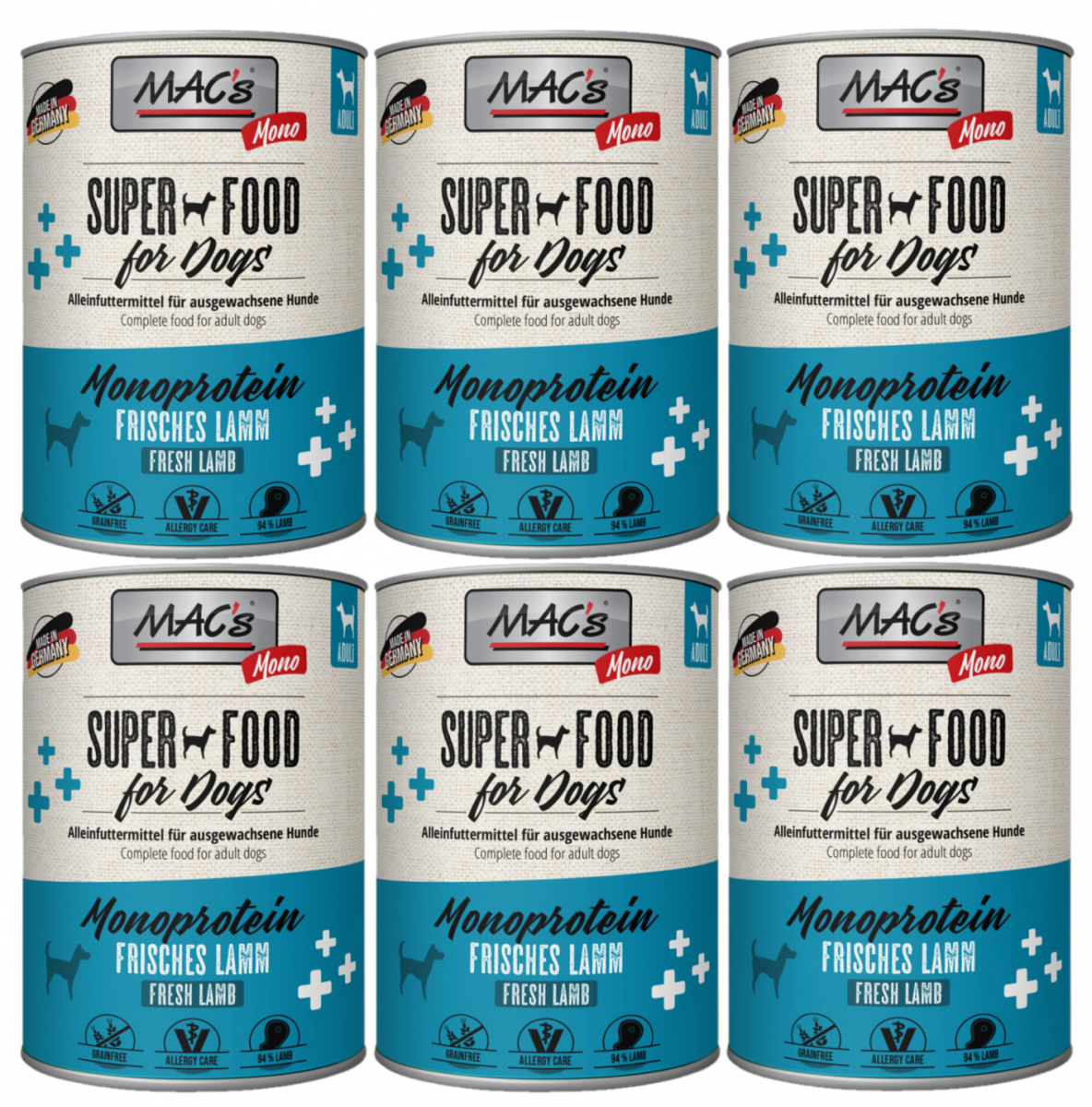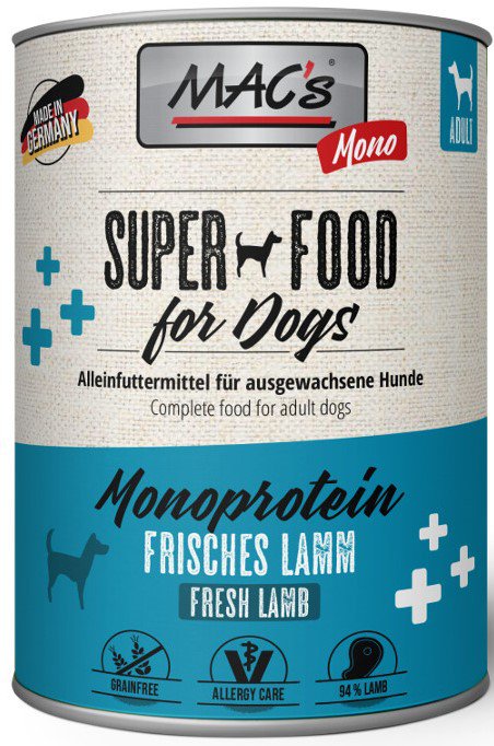 Mac's Dog Mono Jagnięcia składa się wyłącznie z jagnięciny w połączeniu ze słodkimi ziemniakami, dlatego jest szczególnie odpowiednia dla psów z wrażliwym przewodem pokarmowym oraz z alergiami. Specjalna receptura jest wolna od zbóż oraz wysoce smakowita.