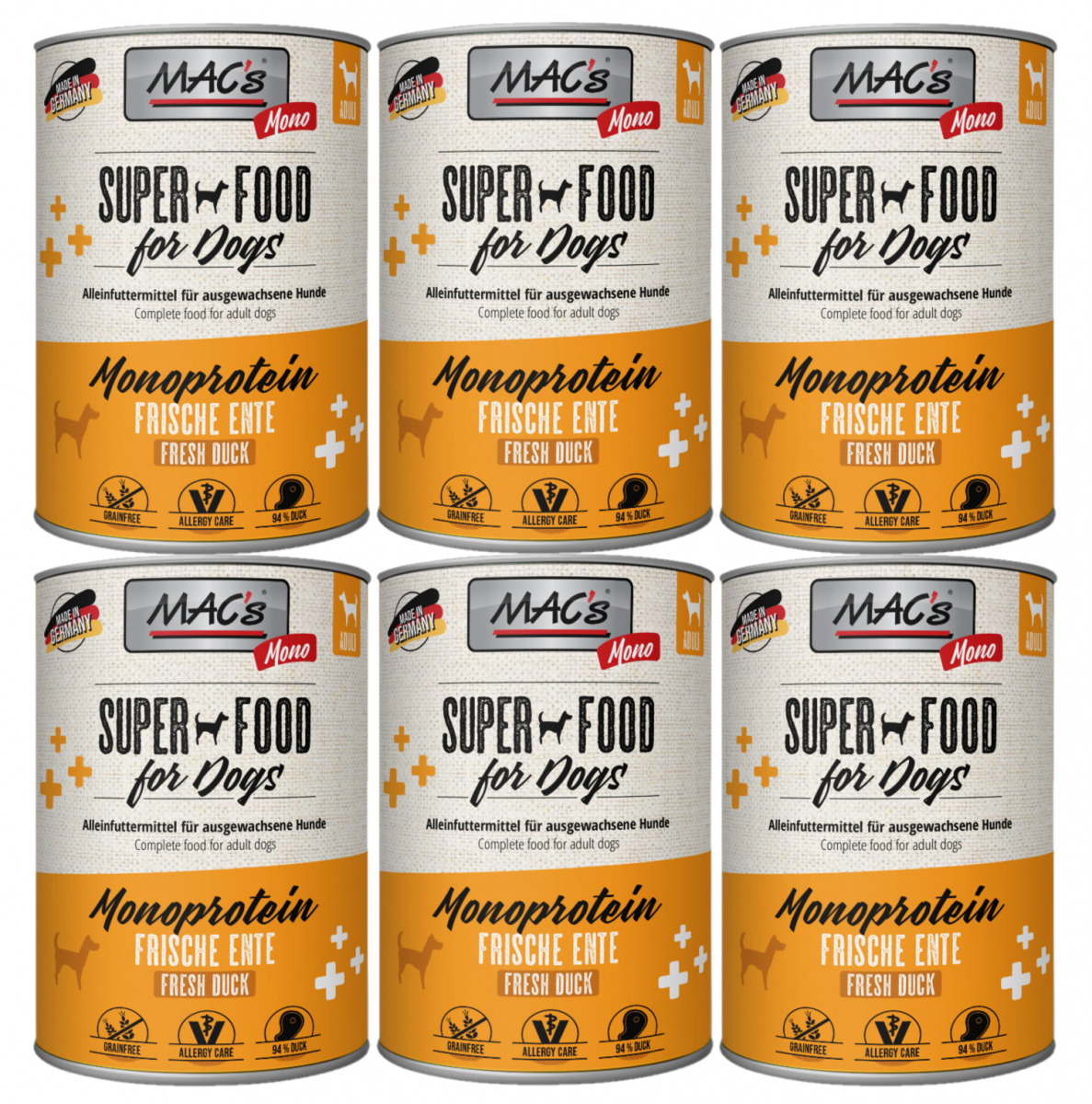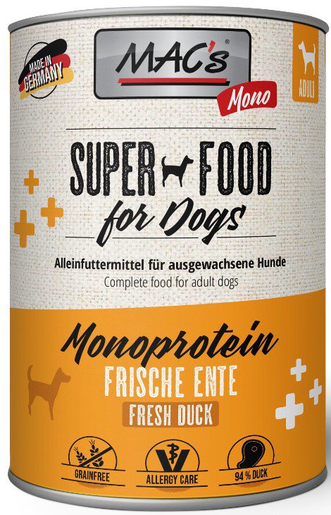 Mac's Dog Świeża Kaczka składa się wyłącznie z kaczki w połączeniu ze słodkimi ziemniakami i groszkiem, dlatego jest szczególnie odpowiednia dla psów z wrażliwym przewodem pokarmowym oraz z alergiami. Specjalna receptura jest wolna od zbóż oraz wysoce smakowita.