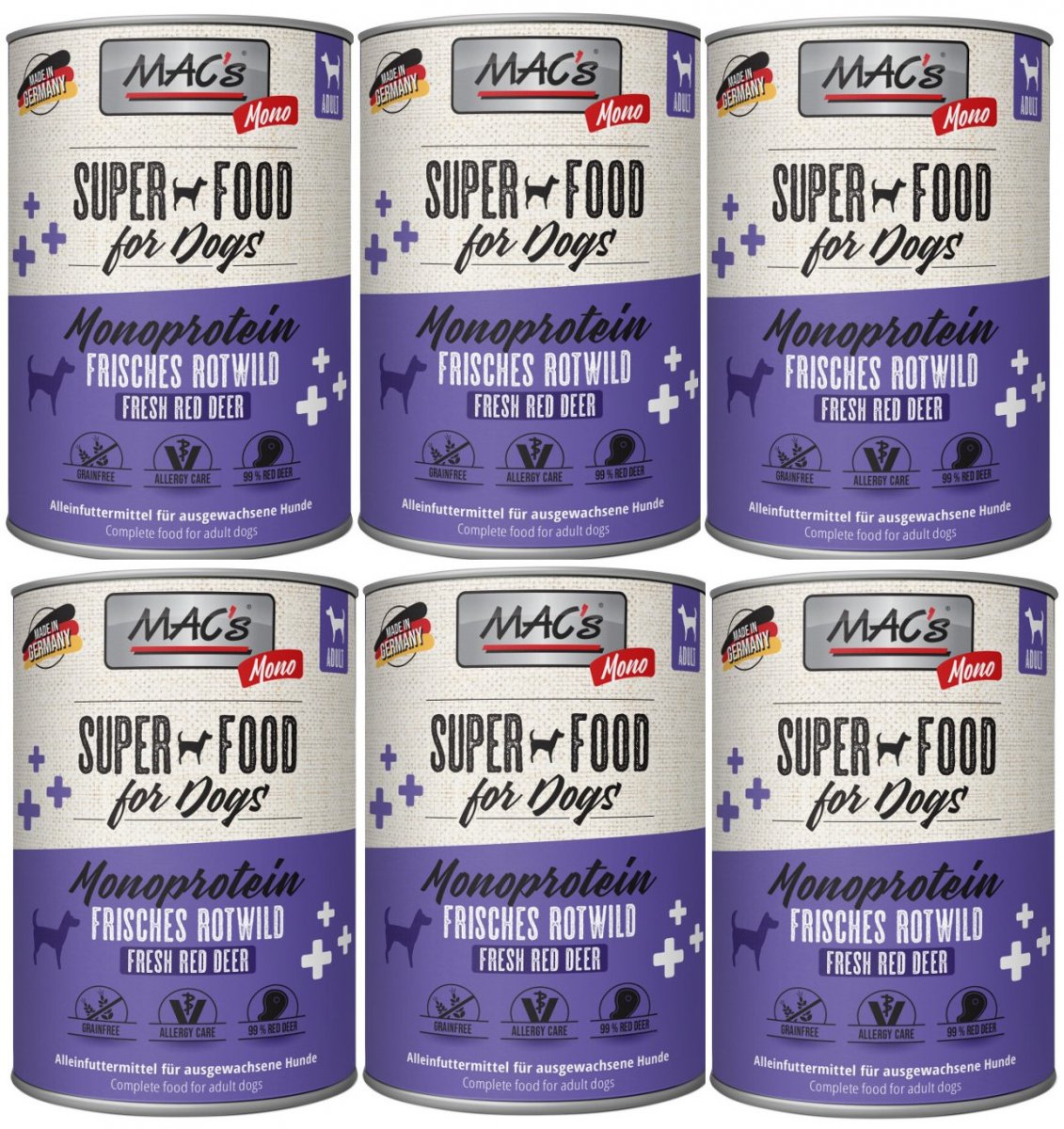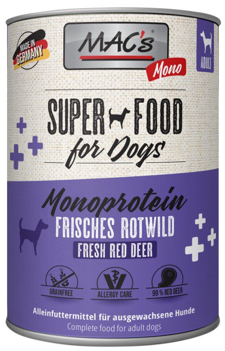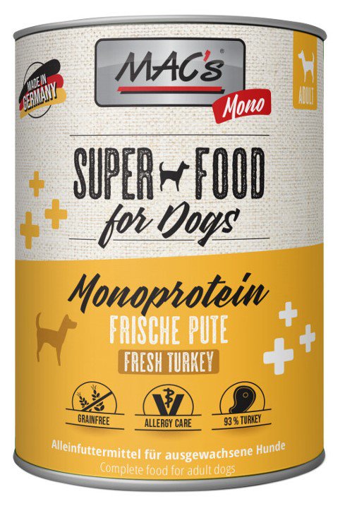 MAC's Dog MONO wyróżnia się szczególną recepturą, która doskonale nadaje się dla wrażliwych psów. Linia monoprotein składa się wyłącznie z jednego rodzaju mięsa. Nie zawiera zbóż, warzyw, owoców, soi, sztucznych aromatów, barwników, ani konserwantów, co sprawia, że nada się dla psów z alergiami i jako dieta eliminacyjna. Wysoka zawartość mięsa jest podstawą karmy, która zapewnia zwierzakom optymalną ilość energii niezbędnej do aktywnego trybu życia. W procesie produkcji nie dodaje się mięsa klejonego, mączki kostnej ani zwierzęcej - jedynie najlepsze mięso i podroby np. serce, płuca czy wątróbkę. Dzięki wysokiej przyswajalności karma nie obciąża dodatkowo układu trawiennego. Nie zawiera również żadnych sztucznych barwników, aromatów czy konserwantów. Ważne witaminy i składniki mineralne uzupełniają skład karmy.